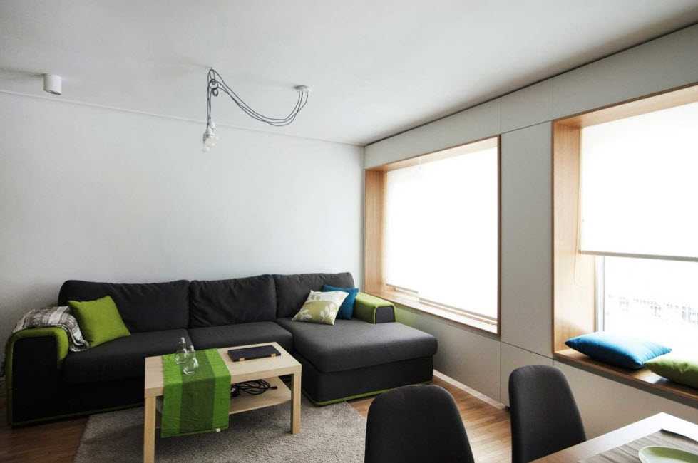 Чтобы естественный свет максимально наполнял пространство, следует отказаться от занавесок на окнах. Интересными деталями могут стать светильники необычных форм, картины, яркие декоративные подушки.