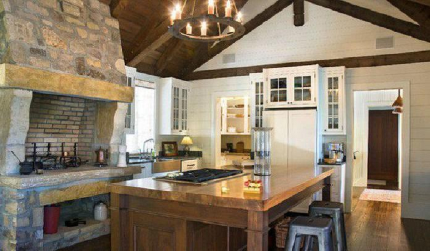 Одним из наиболее часто используемых атрибутов в оформлении кухонного интерьера принято считать небольшие камины или печи. Если не строить чердачное помещение и потолочное перекрытие оставить открытым, то после возведения каминной печи кухня становится похожей на охотничий домик.