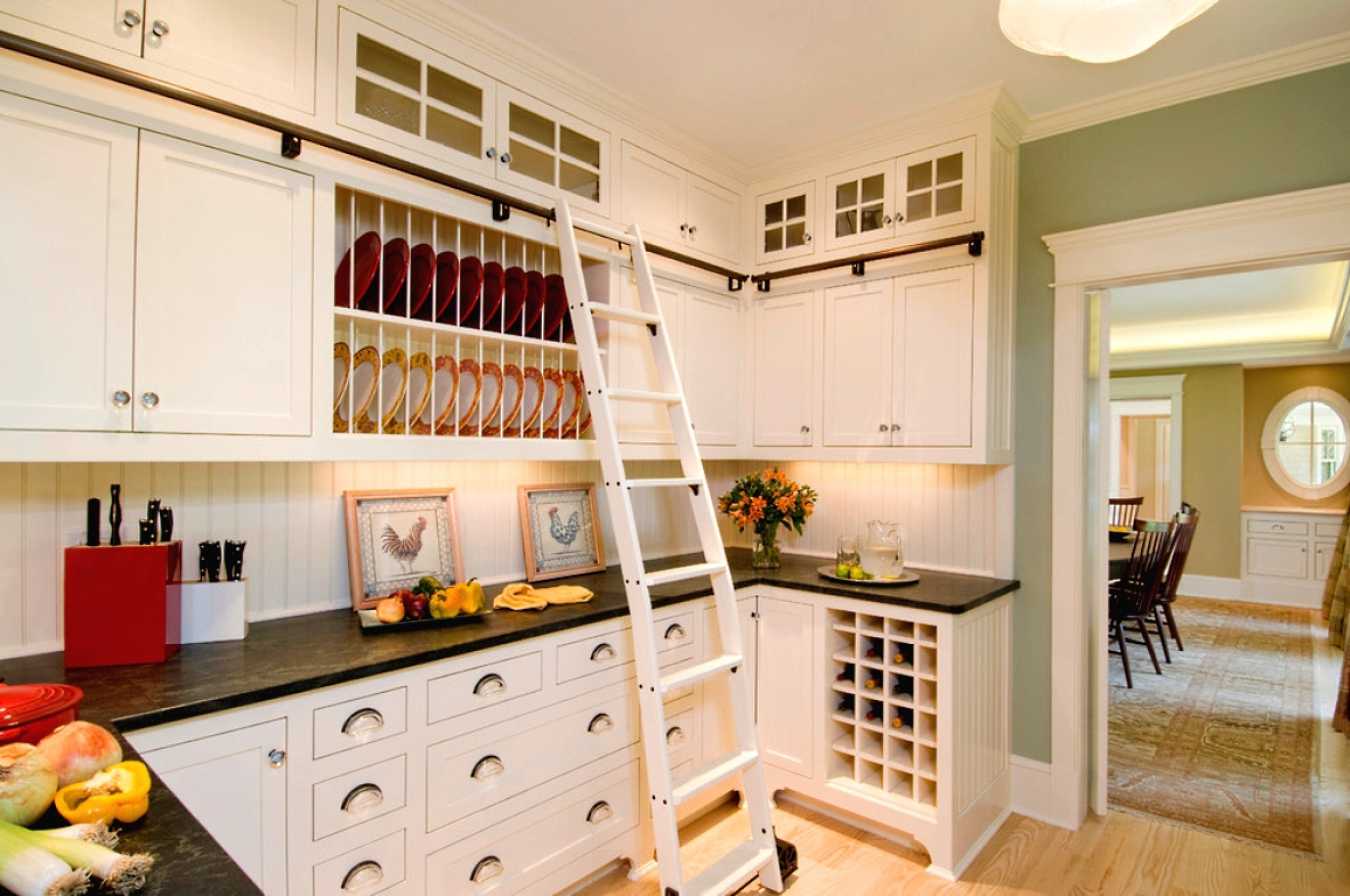 На верхних полках и в верхних ящиках обычно хранят вещи не ежедневного использования, то, что редко требуется. Например, праздничная посуда, консервация, скатерти, хозяйственные товары и так далее.
