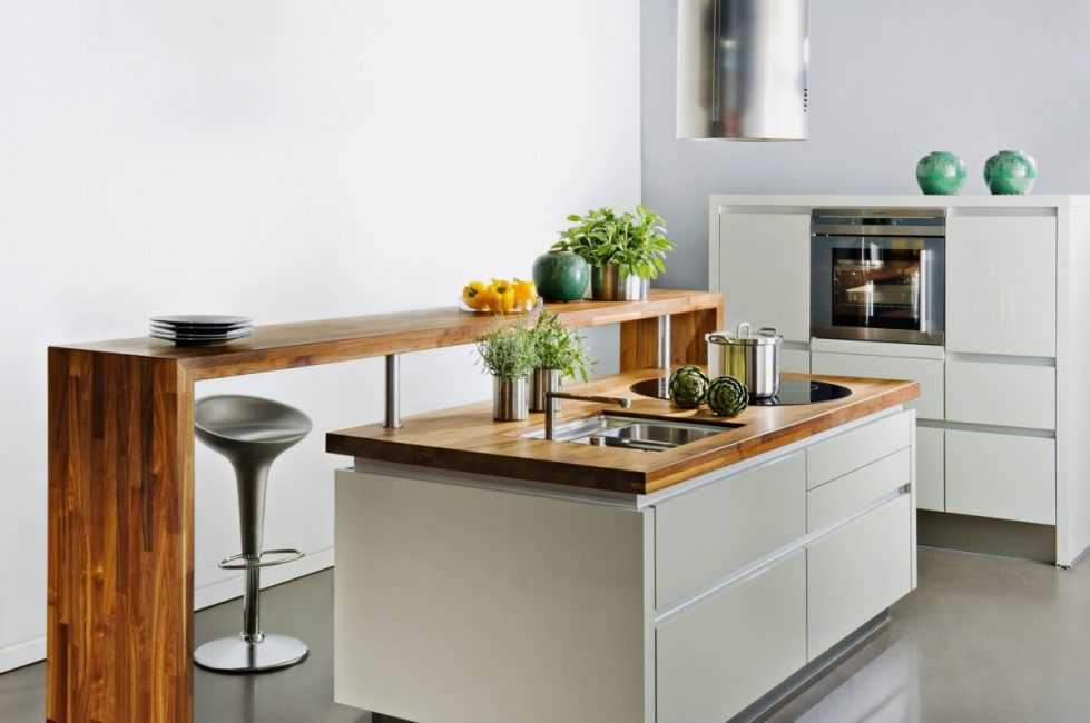 В этом случае барная стойка будет служить дополнительной рабочей поверхностью и выполнит функцию зонирования.