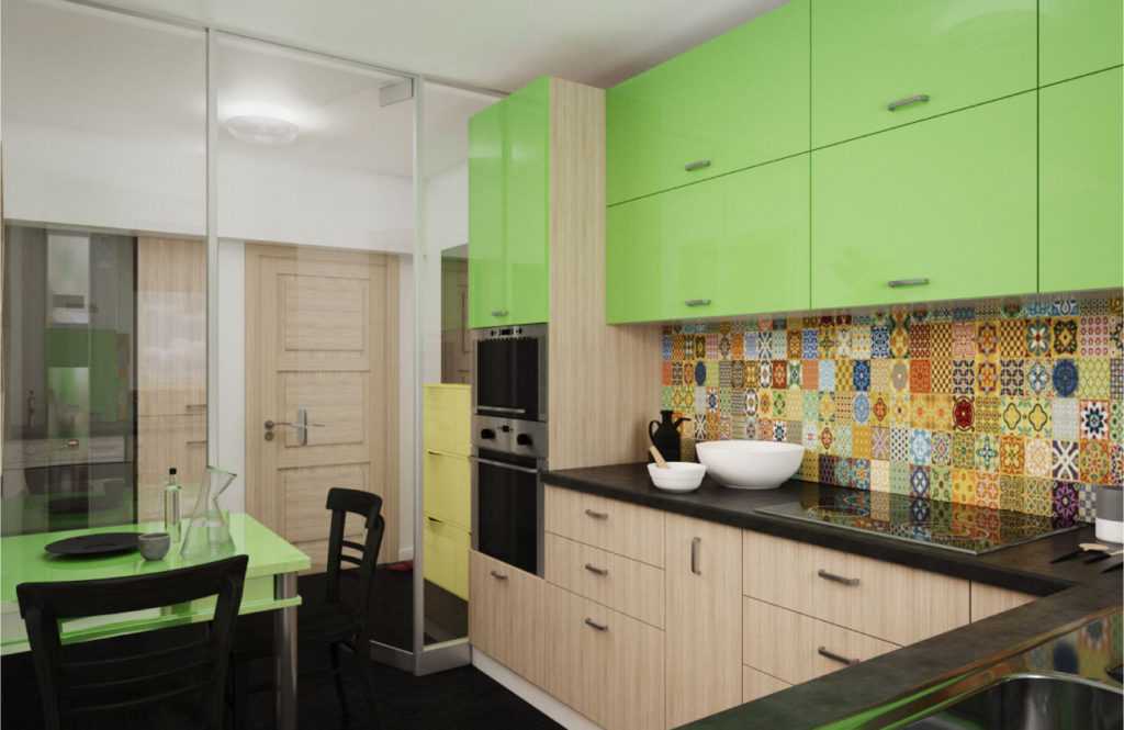 Можно выделить определенный фрагмент фартука тем же оттенком, что и фасады. Например, выделяем зону плиты в той же расцветке, что и гарнитур. Цвет может откликаться в мозаичной плитке, местами повторяя цвет фасадов. Этот прием поможет объединить и разнообразить комнату.