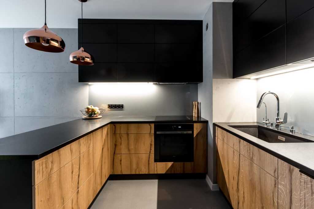 Если у вас темная кухня — практически черная либо на границе с этим цветом, это еще не значит, что тема с рабочей поверхностью под дерево для вас закрыта.