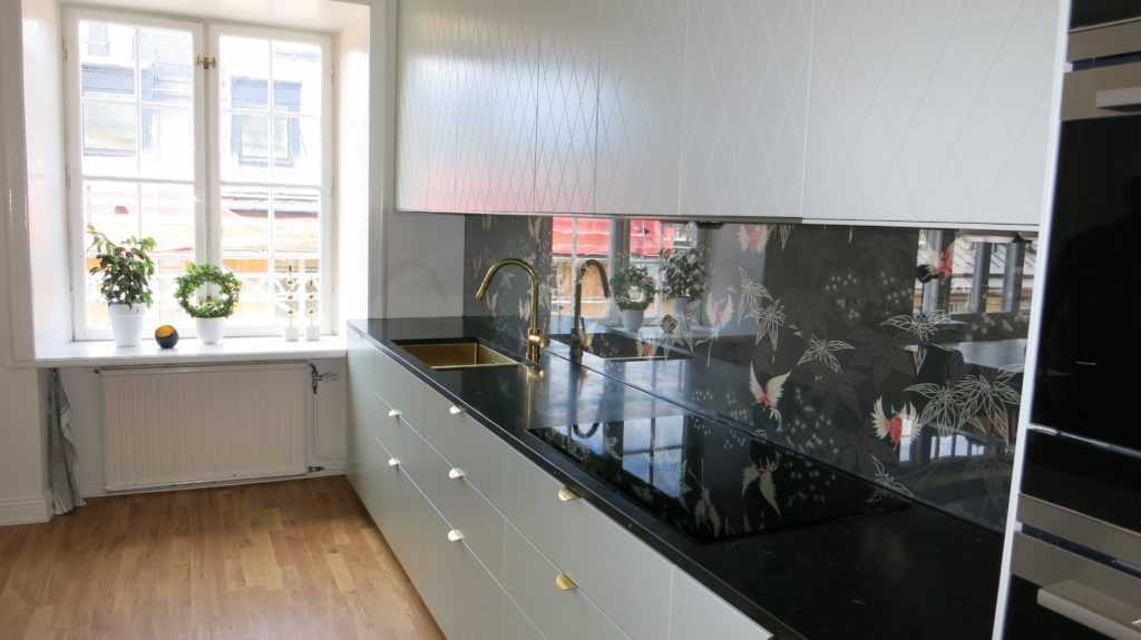 Черные столешницы с каждым годом становятся все более популярными. Неудивительно, что блестящая черная столешница считается многими синонимом роскоши, хорошего вкуса и элегантности. Уникальность ее, к сожалению, имеет свою цену не только в прямом смысле — ее довольно сложно оформить и она требует тщательного планирования других элементов кухонного декора.