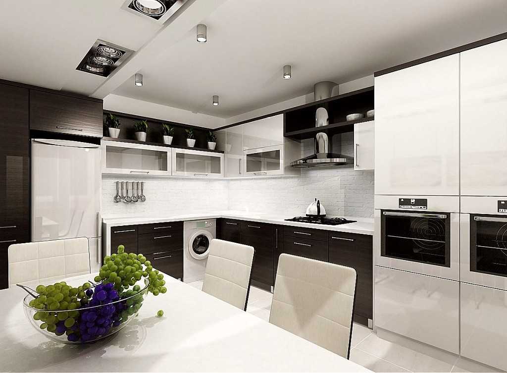 Про преимущество белого для маленькой кухни мы уже упоминали выше, но стоит оговориться, что и для средних и больших помещений преимущественно белый фон будет казаться холодным и неуютным. Его можно также обыграть яркими вкраплениями, а черный оставить в многочисленных мелких деталях.