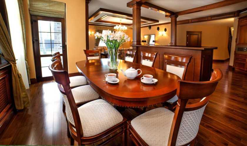 Особое внимание уделите обустройству обеденной зоны. Для просторных кухонь можно приобрести массивный деревянный стол и к нему мягкие стулья