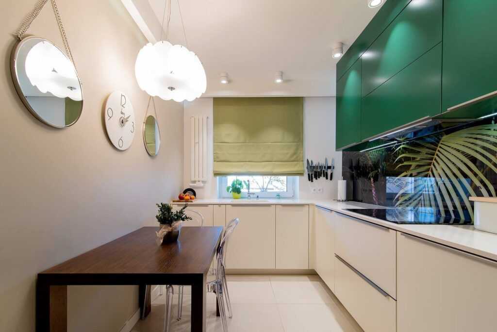 С помощью такого приема можно зрительно увеличить комнату, расширить ее или сделать светлее. Хорошо смотрятся оригинальные фотообои на одной из стен, фартук над рабочей поверхностью в виде зеркальной мозаики или космической формы вытяжка над плитой.