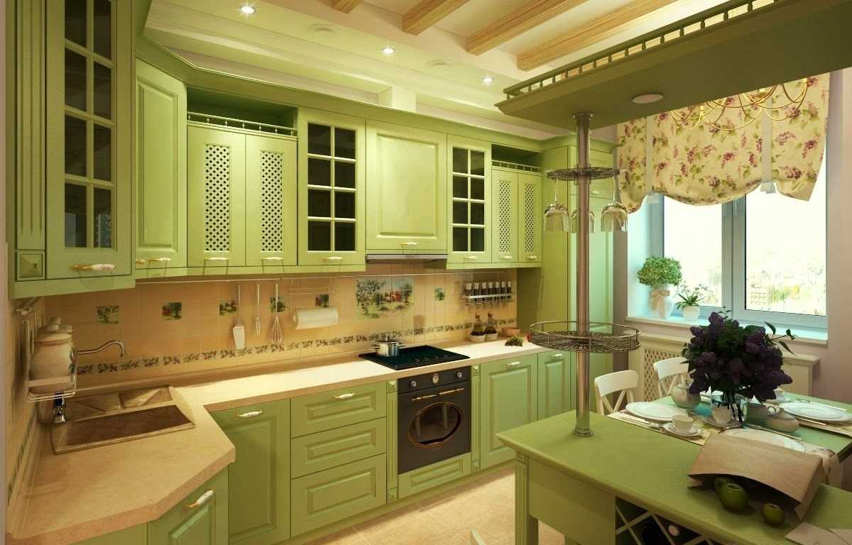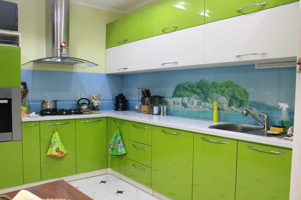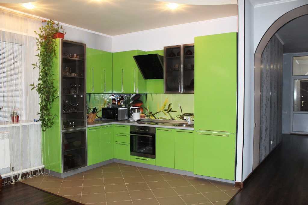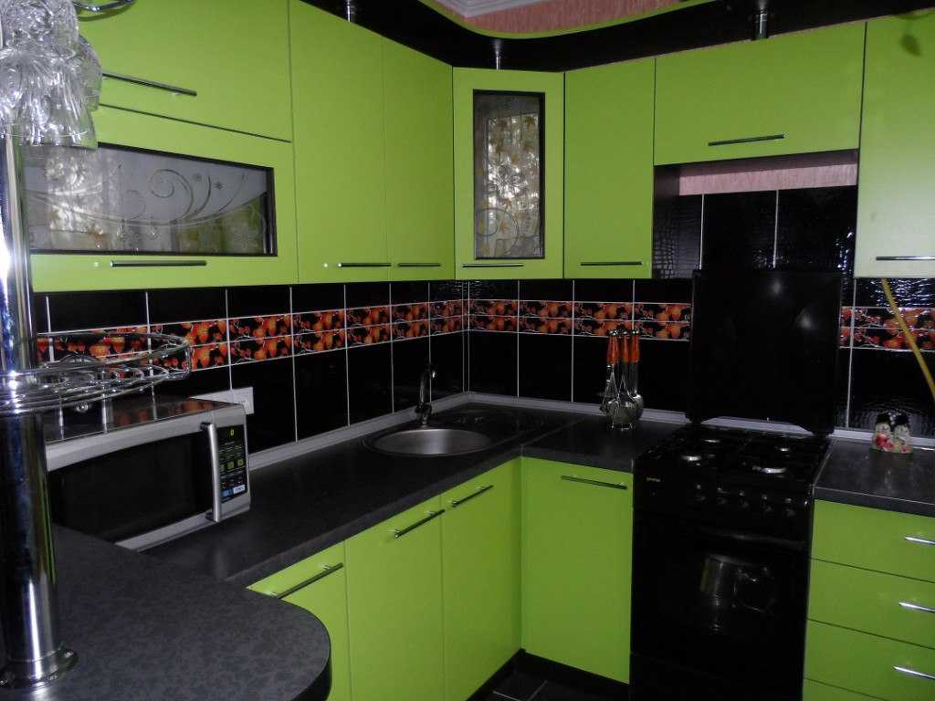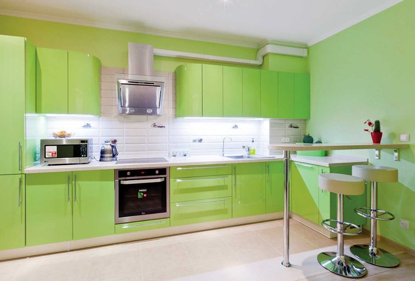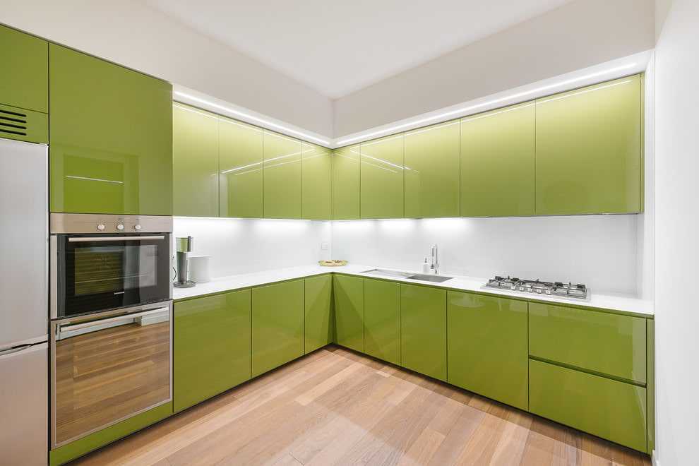 Салатовый цвет позволяет создавать гармоничность стен в сочетании с гарнитурой образованной светлыми или темными версиями фасадов.