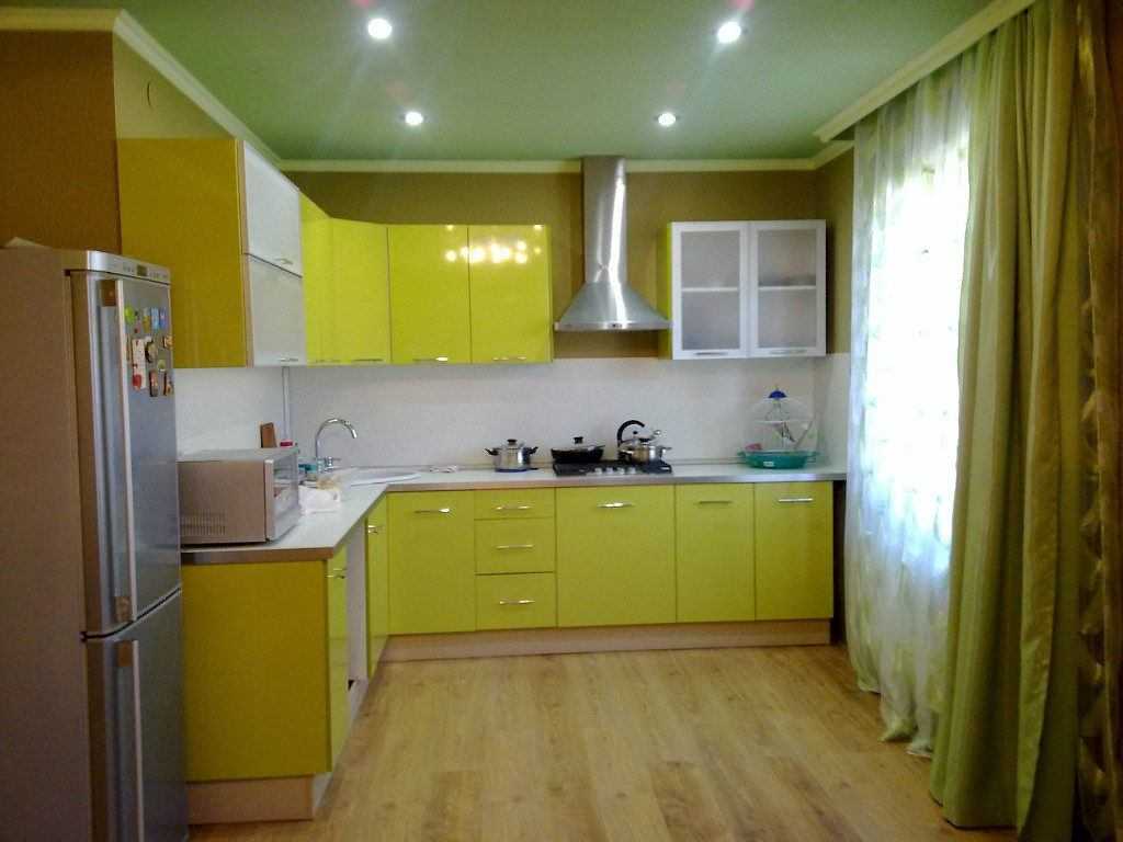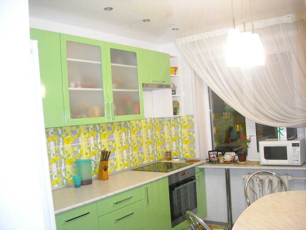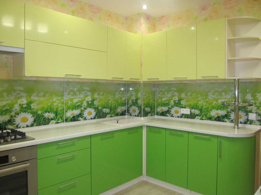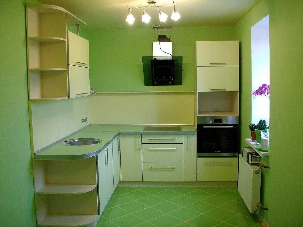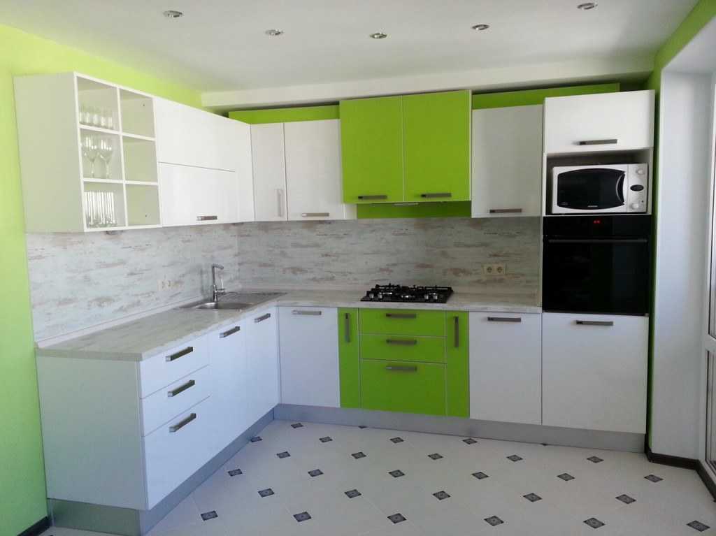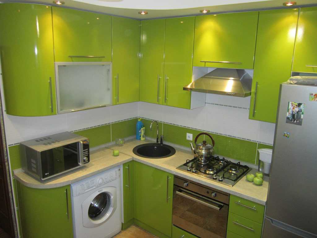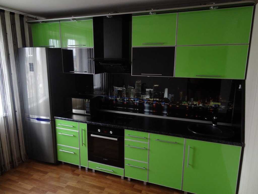 Салатовый цвет позволяет создавать гармоничность стен в сочетании с гарнитурой образованной светлыми или темными версиями фасадов.