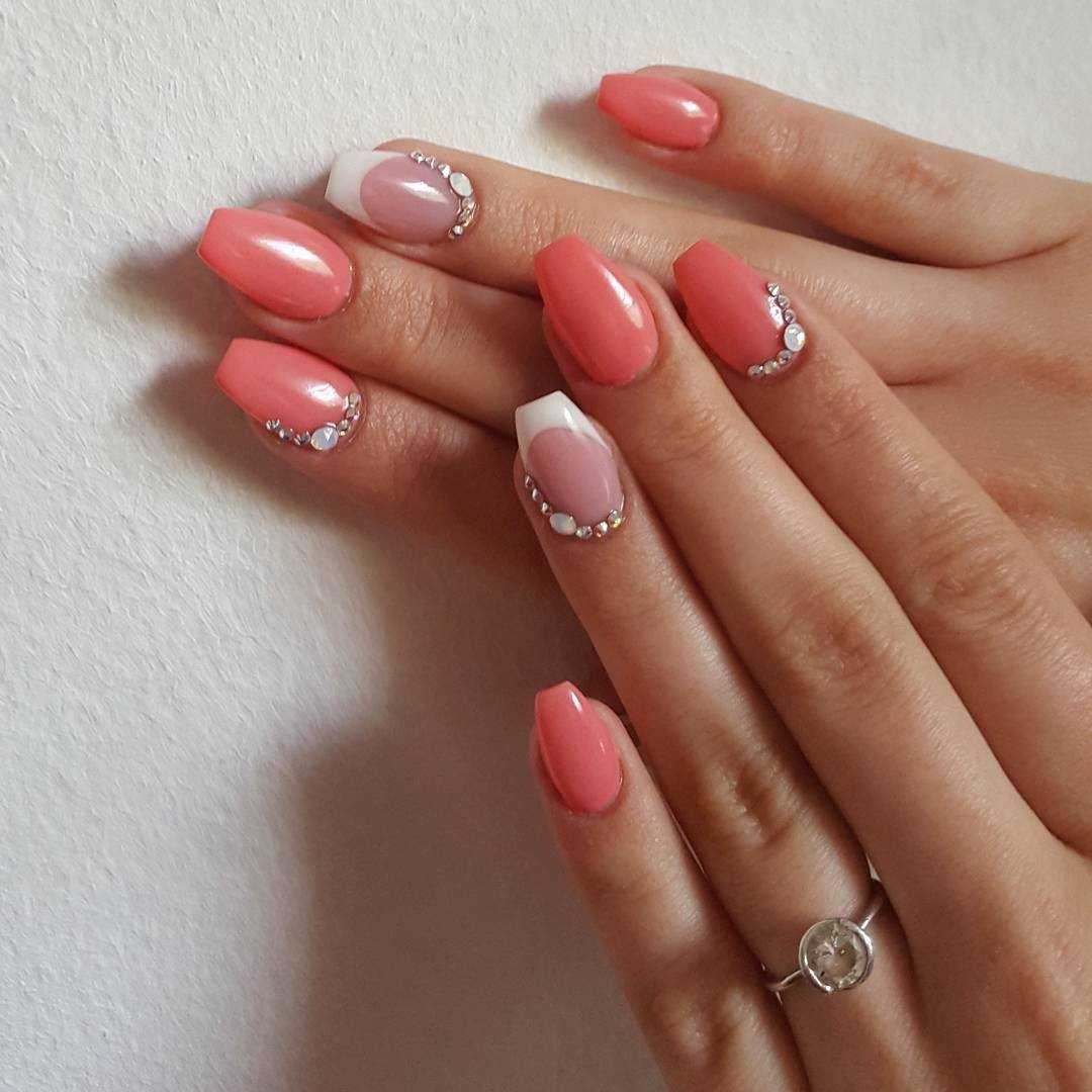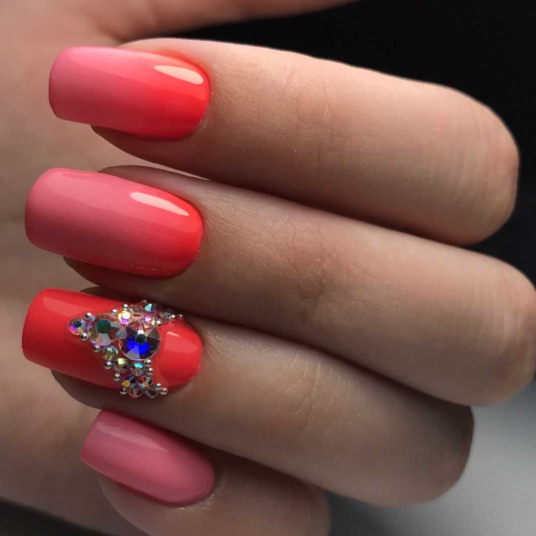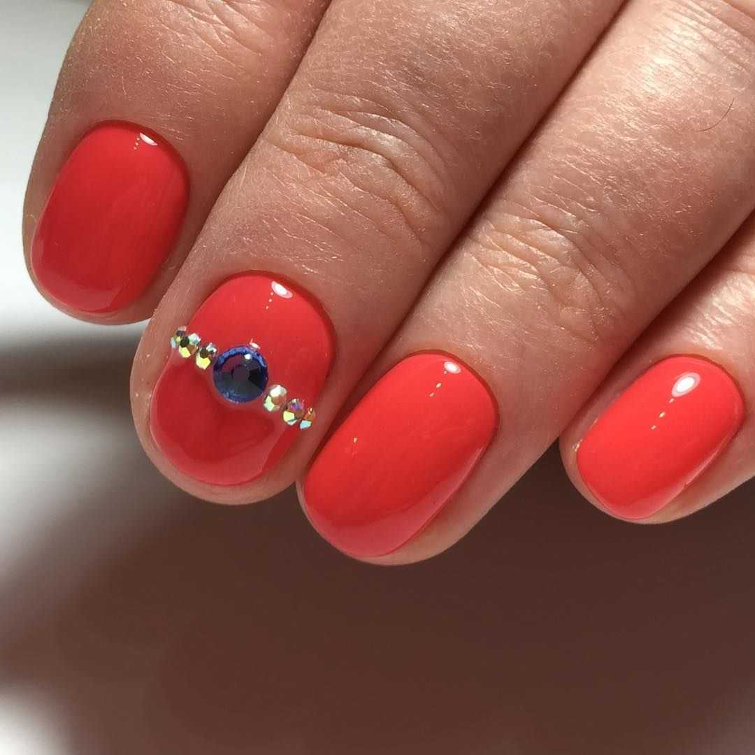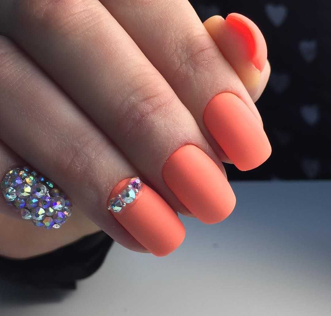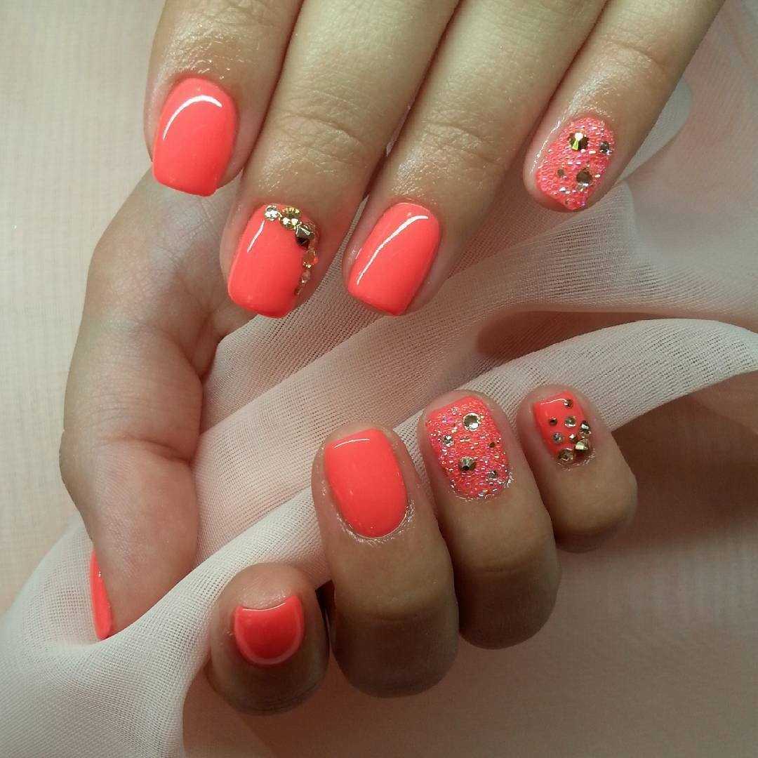 Коралловый цвет – настоящая находка для обладательниц коротких ногтей. Цвет удивительно красиво смотрится на овальных и квадратных ногтях. Стразы на коротких ногтях располагают также как и на длинных. При этом количество материала значительно уменьшается.