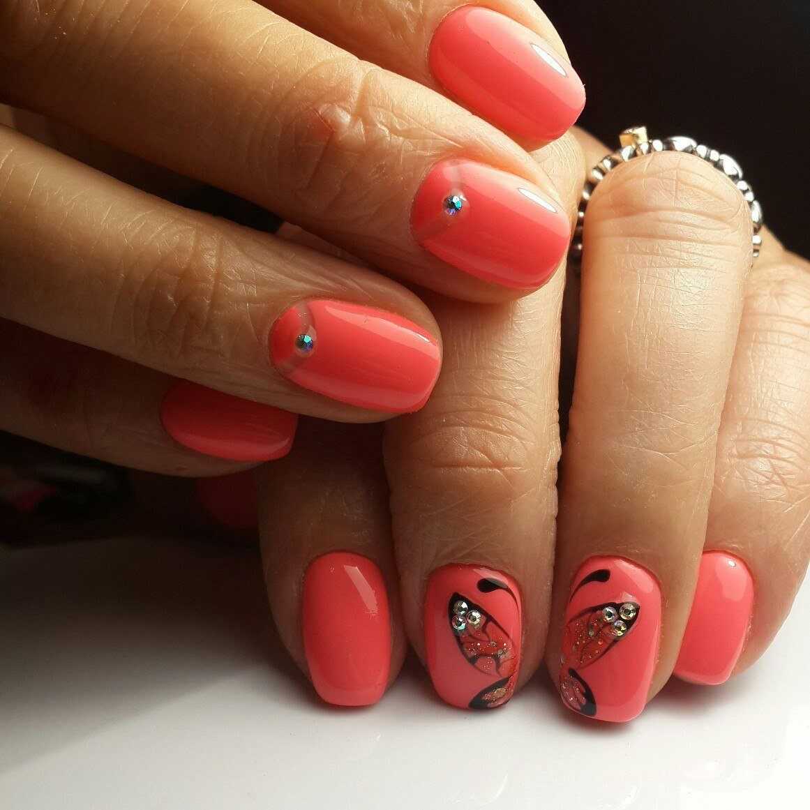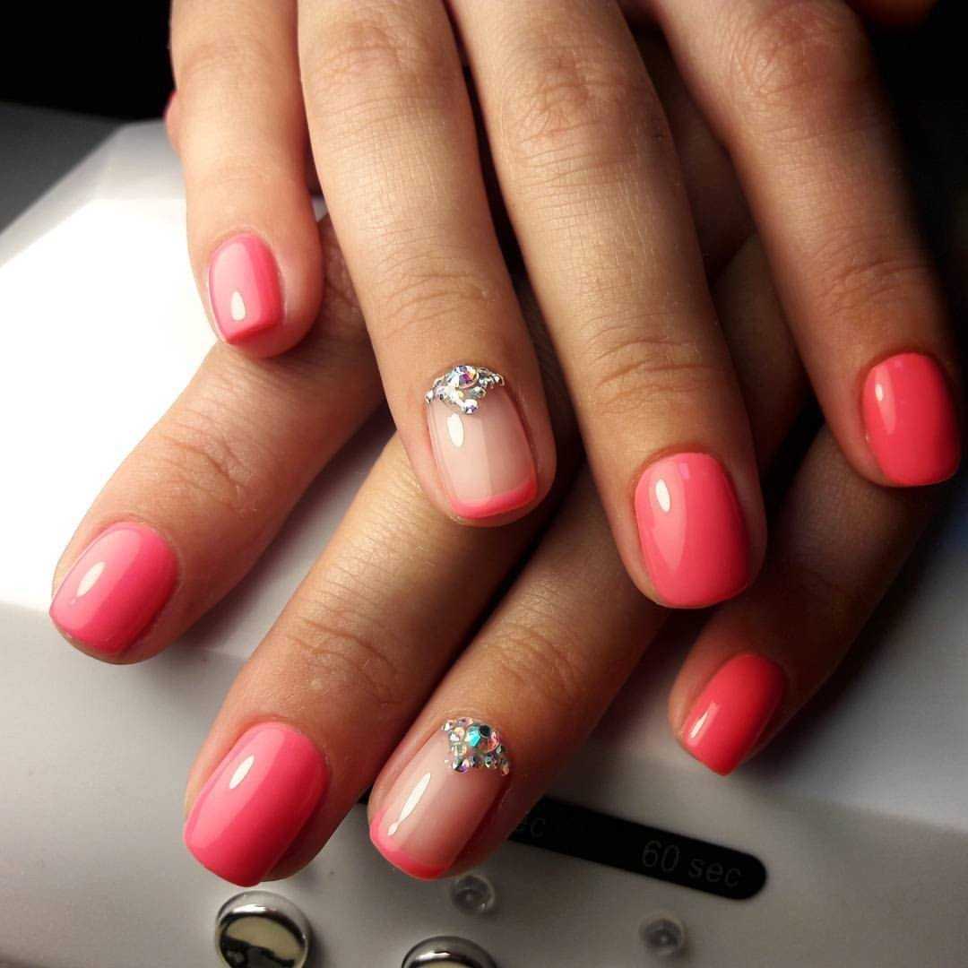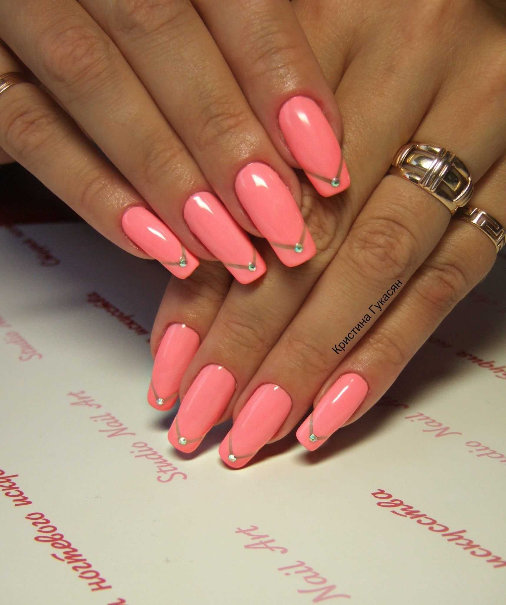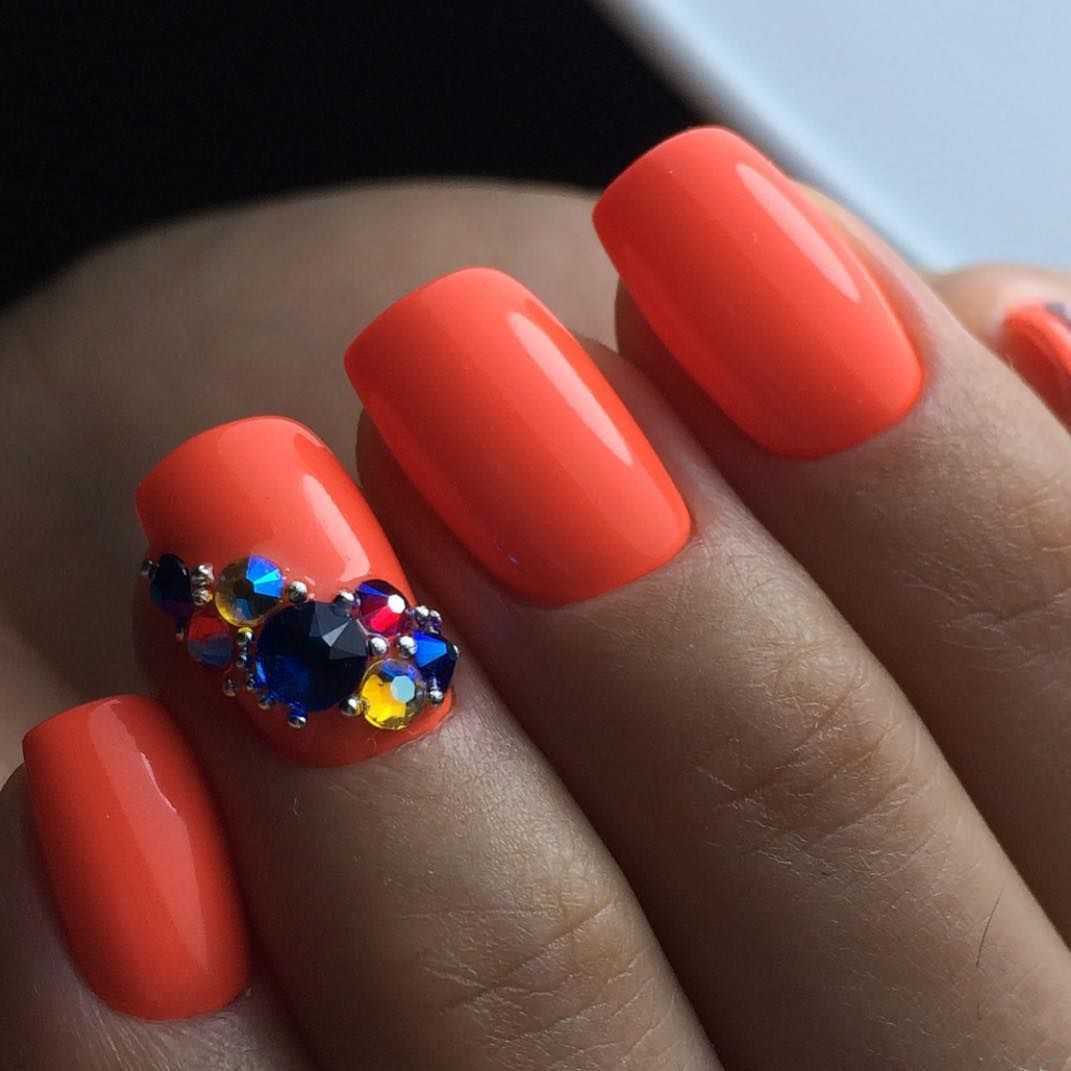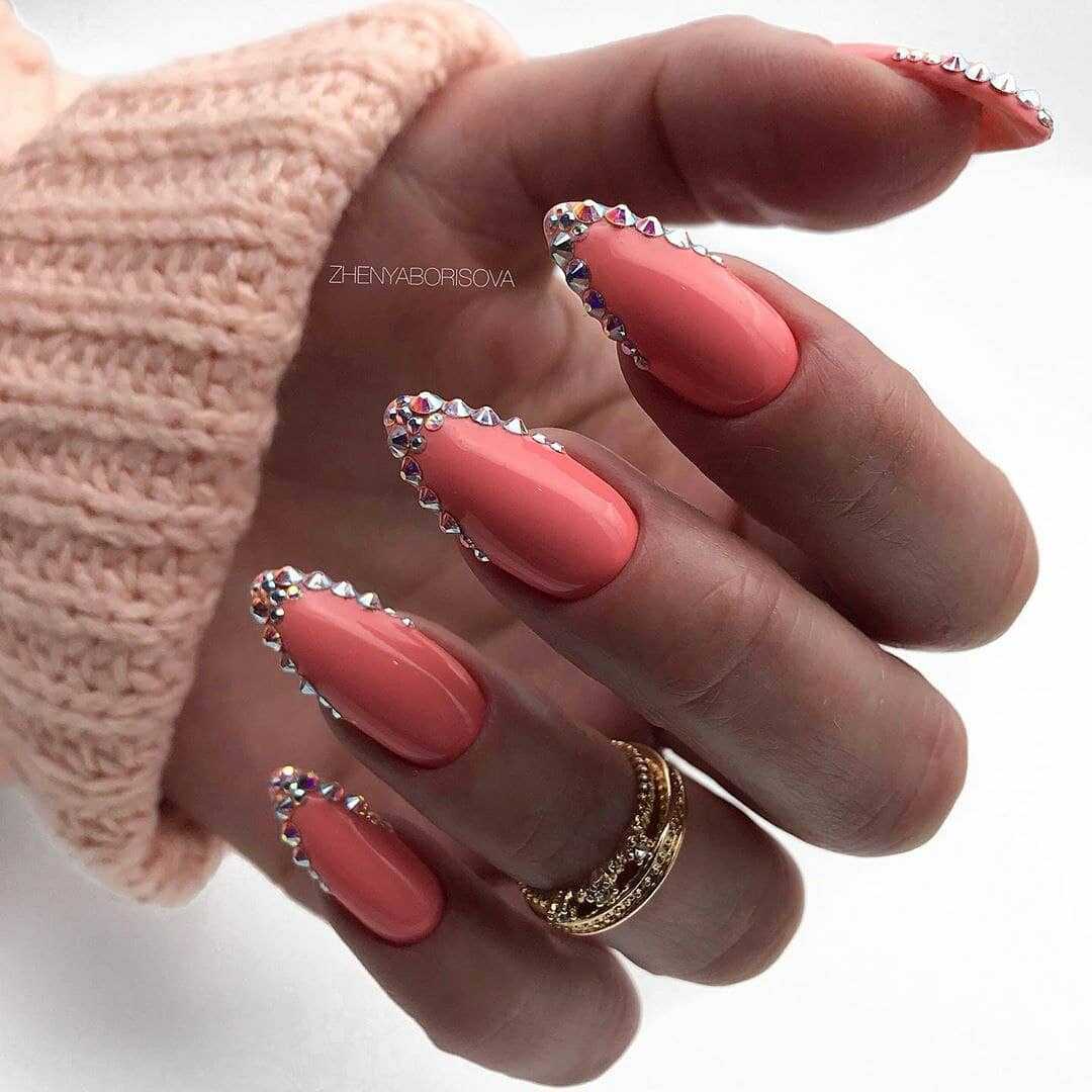 Коралловый цвет – настоящая находка для обладательниц коротких ногтей. Цвет удивительно красиво смотрится на овальных и квадратных ногтях. Стразы на коротких ногтях располагают также как и на длинных. При этом количество материала значительно уменьшается.