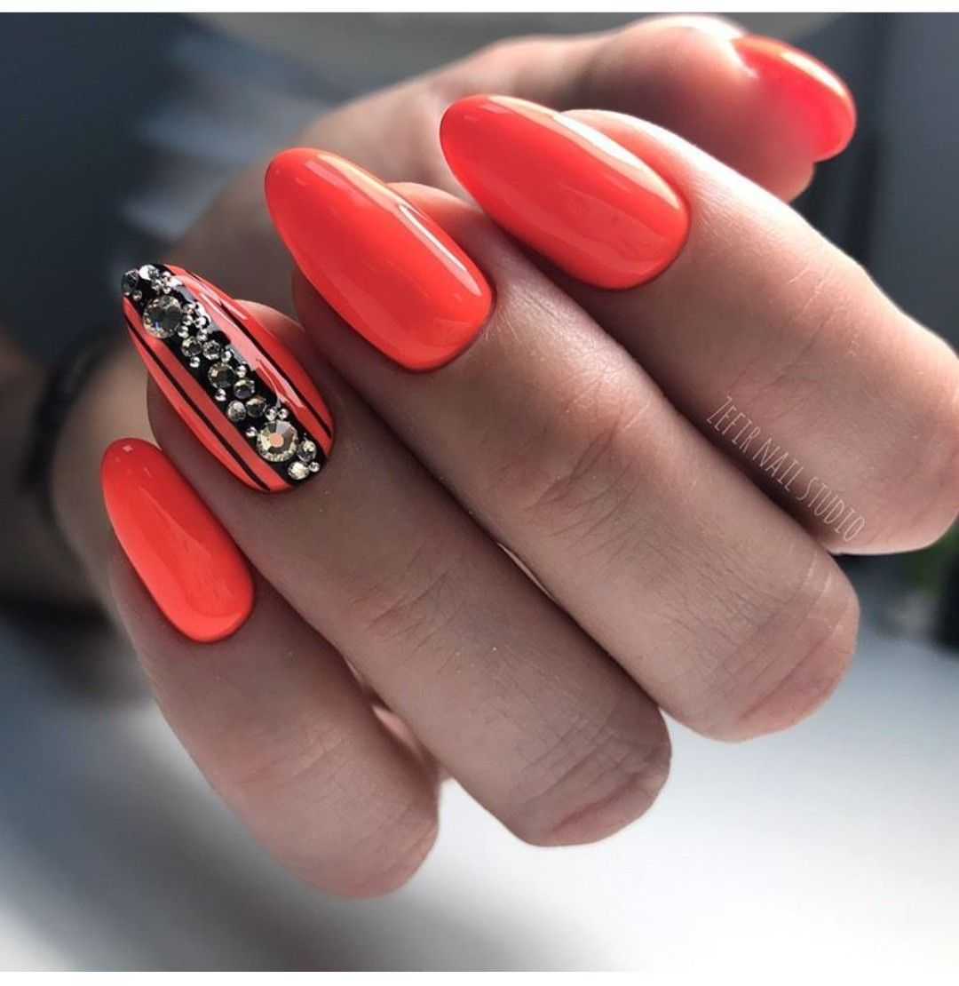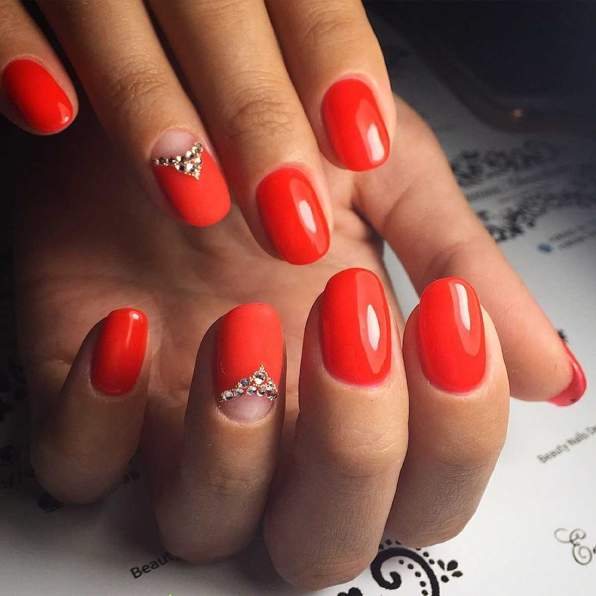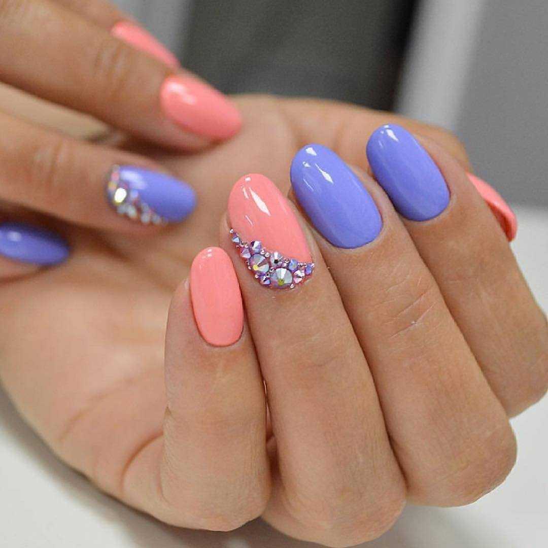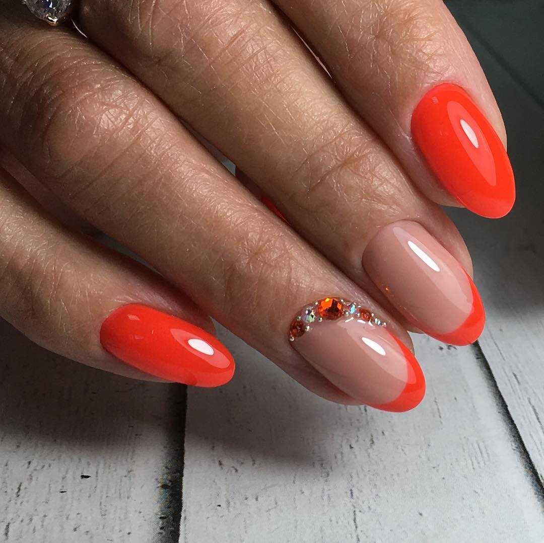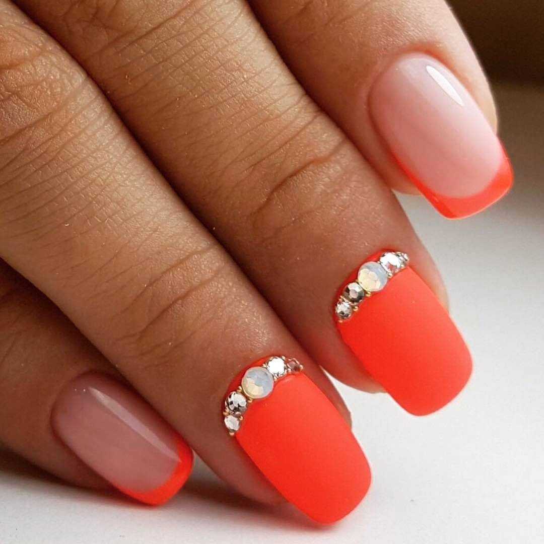 Коралловый цвет – настоящая находка для обладательниц коротких ногтей. Цвет удивительно красиво смотрится на овальных и квадратных ногтях. Стразы на коротких ногтях располагают также как и на длинных. При этом количество материала значительно уменьшается.