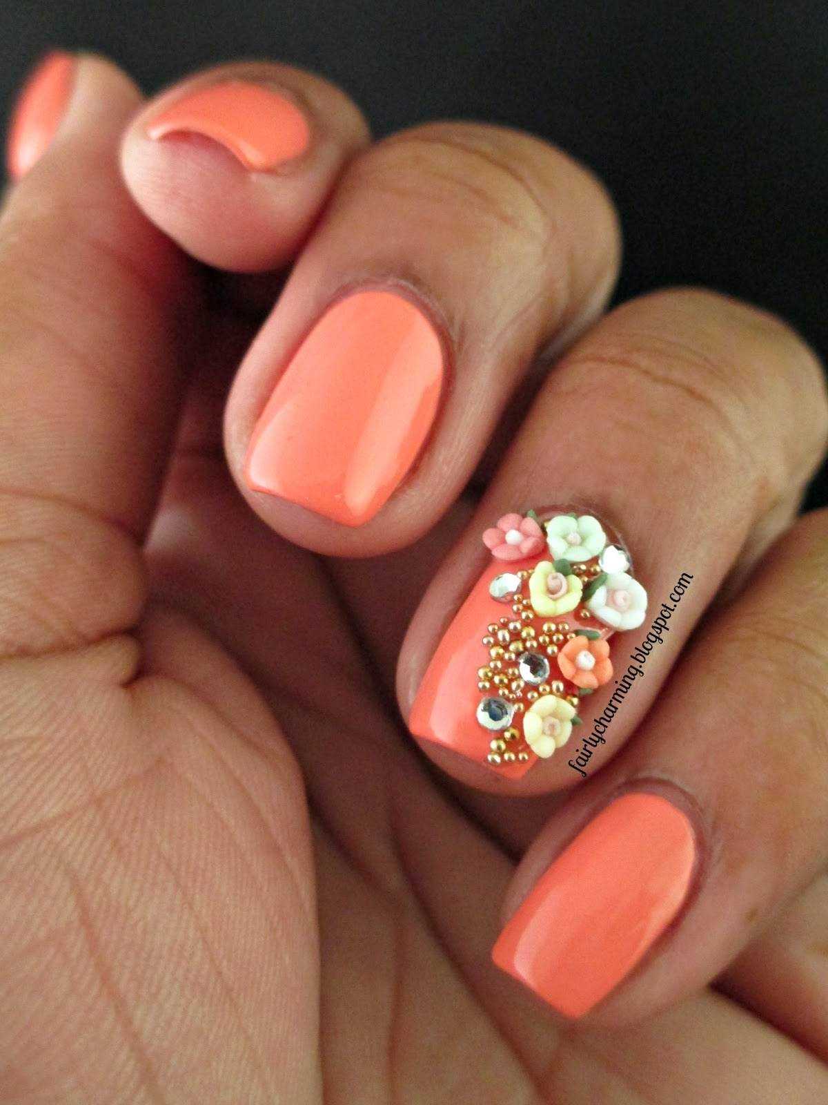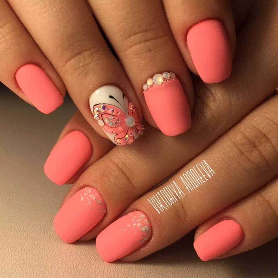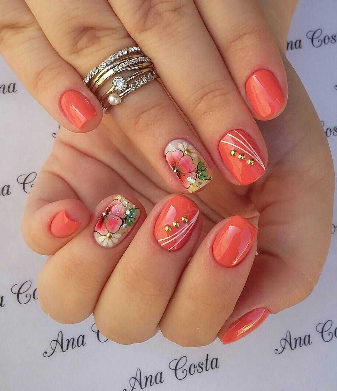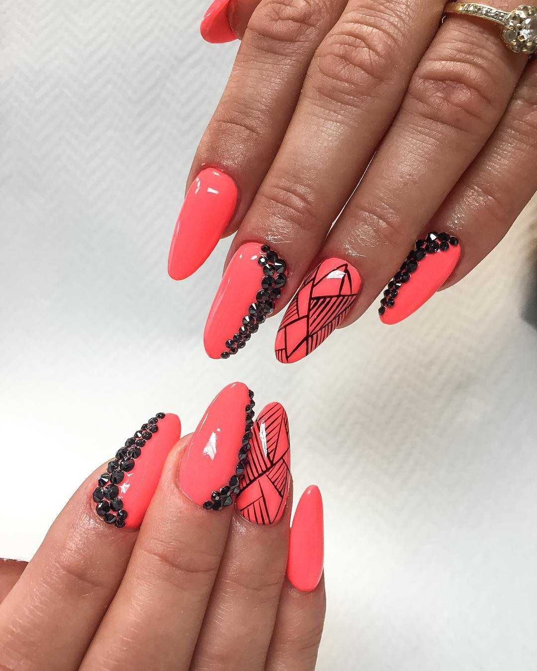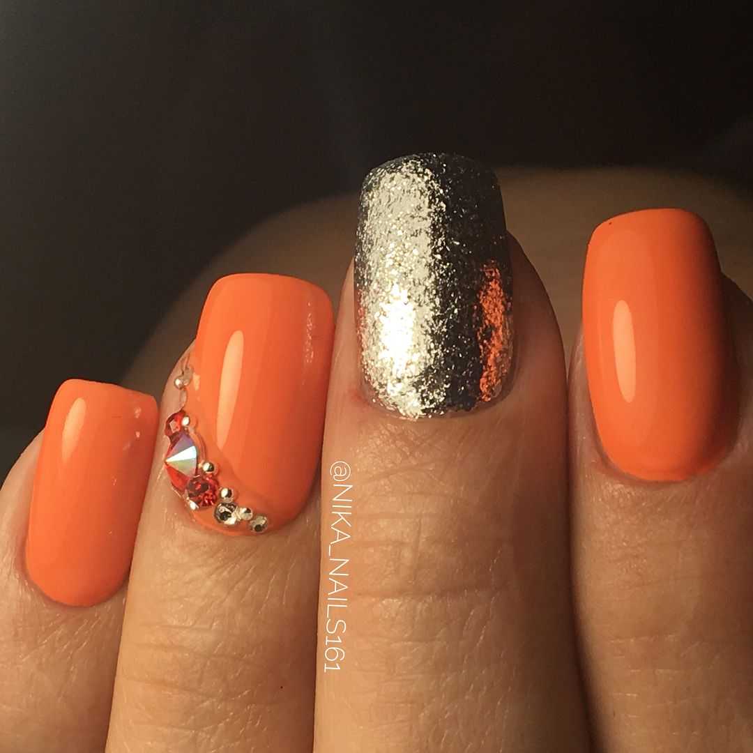 Коралловый цвет – настоящая находка для обладательниц коротких ногтей. Цвет удивительно красиво смотрится на овальных и квадратных ногтях. Стразы на коротких ногтях располагают также как и на длинных. При этом количество материала значительно уменьшается.