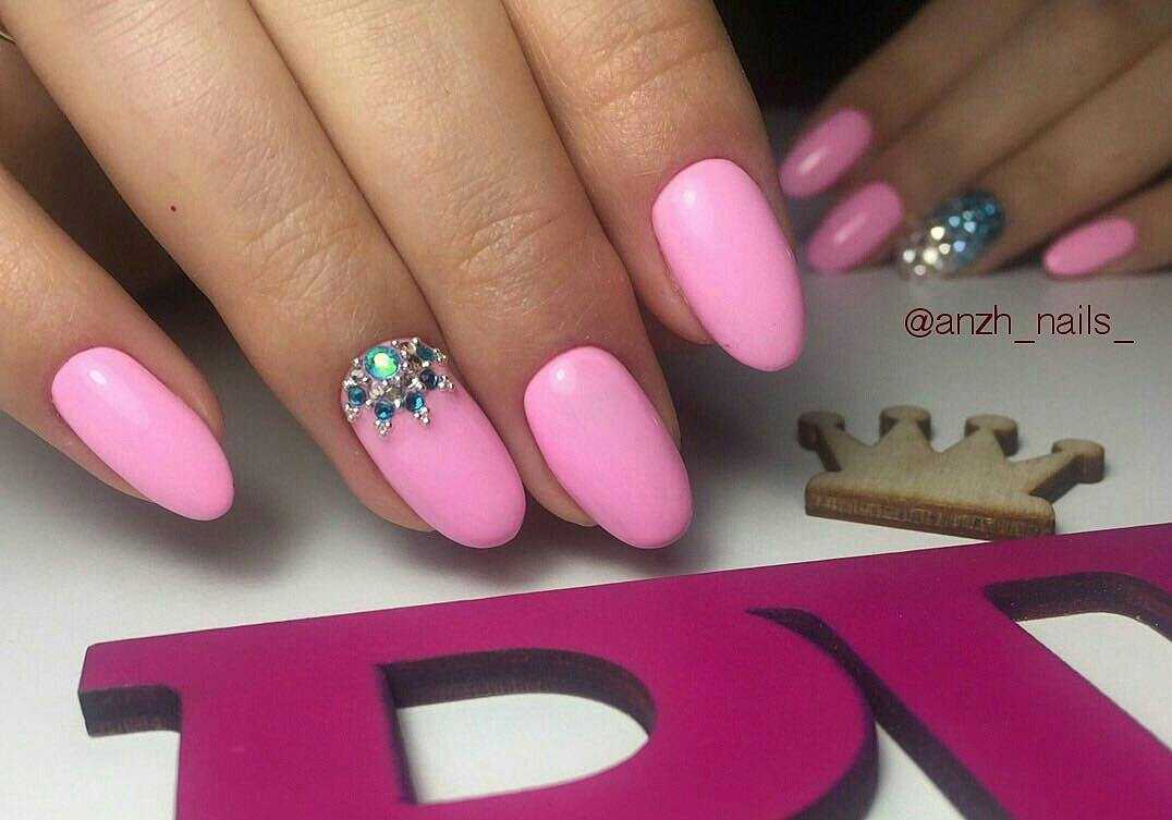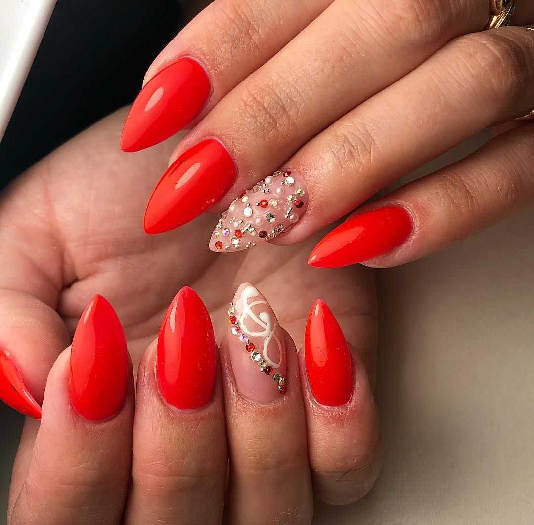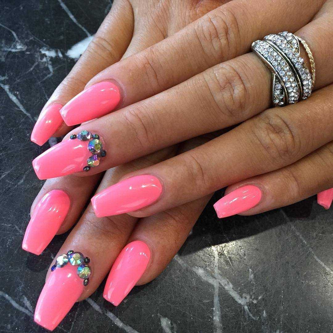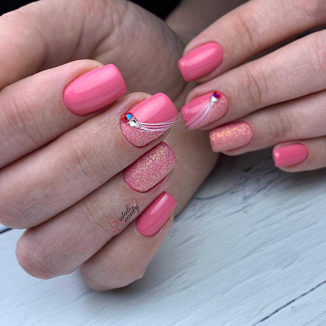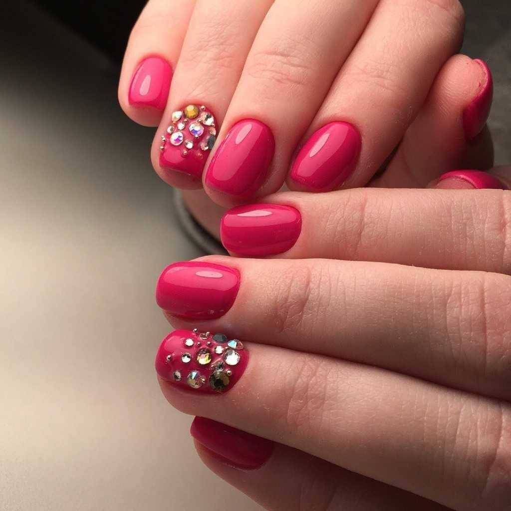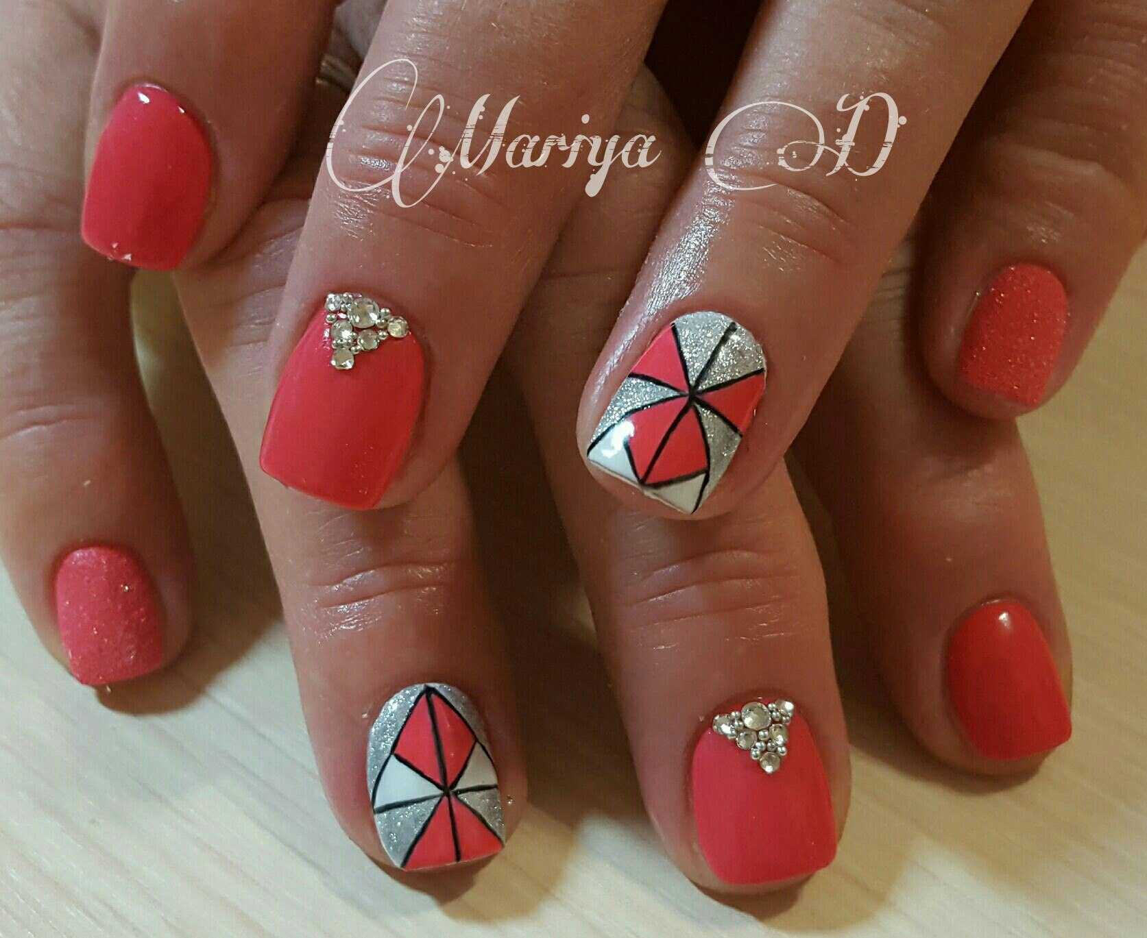 Коралловый цвет – настоящая находка для обладательниц коротких ногтей. Цвет удивительно красиво смотрится на овальных и квадратных ногтях. Стразы на коротких ногтях располагают также как и на длинных. При этом количество материала значительно уменьшается.
