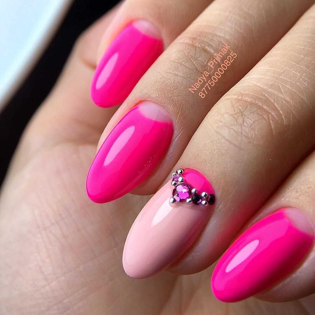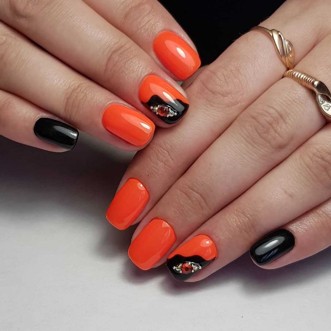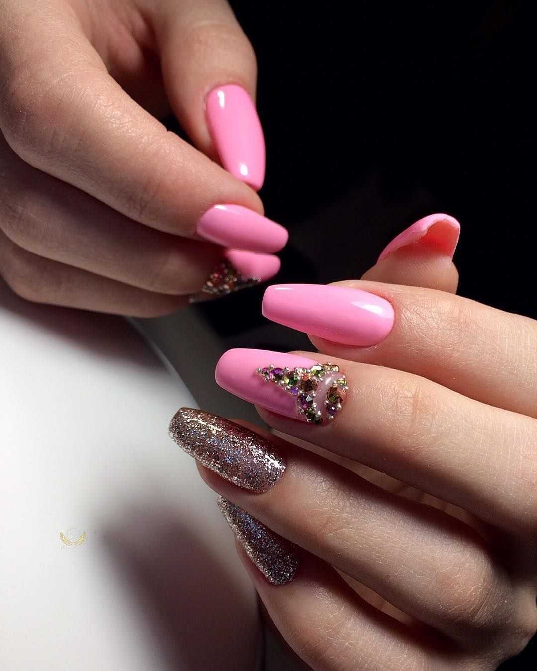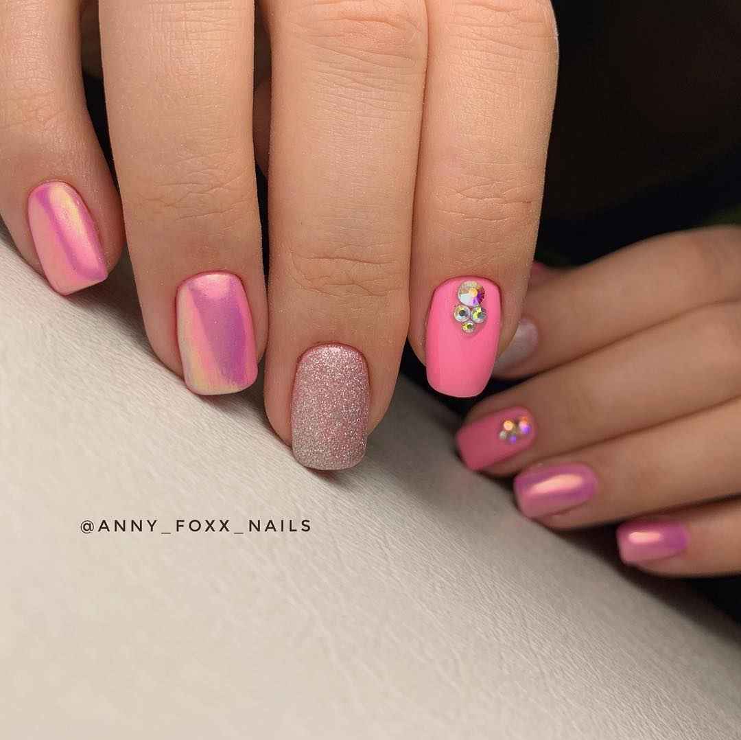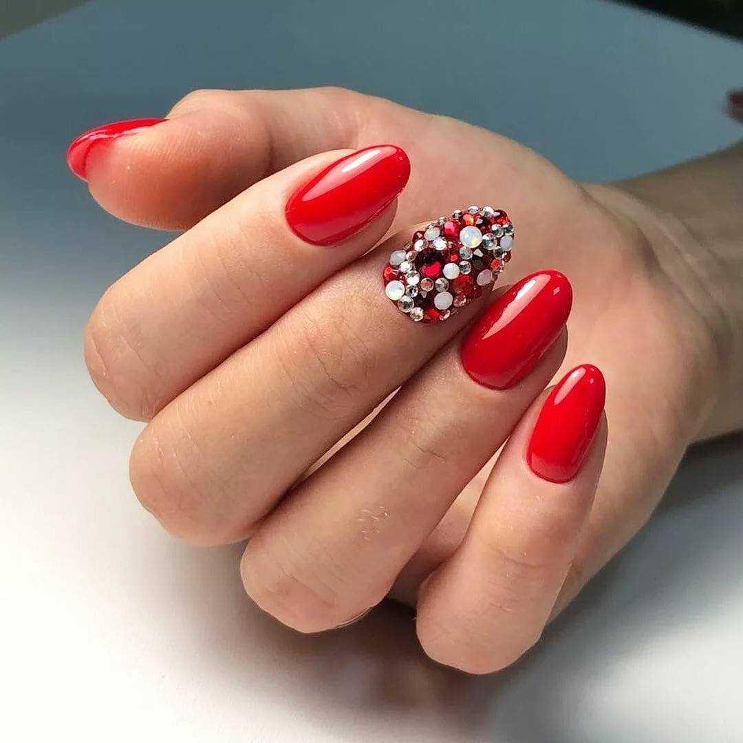 Коралловый цвет – настоящая находка для обладательниц коротких ногтей. Цвет удивительно красиво смотрится на овальных и квадратных ногтях. Стразы на коротких ногтях располагают также как и на длинных. При этом количество материала значительно уменьшается.