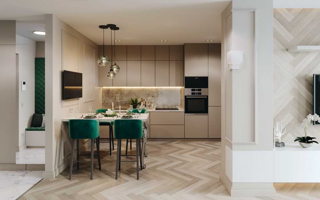 Зеленые оттенки полностью приспосабливаются к модной обстановке этой кухни