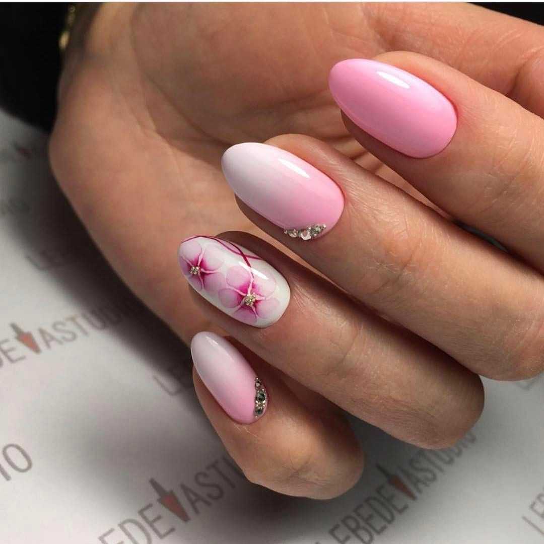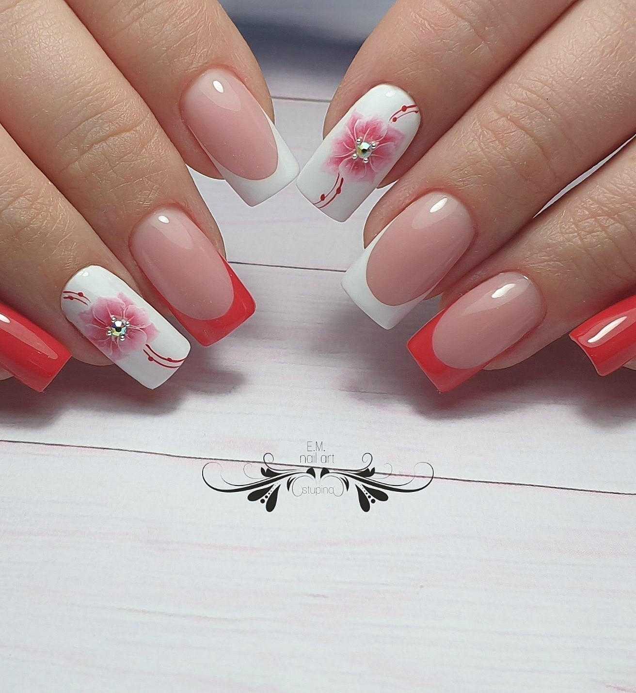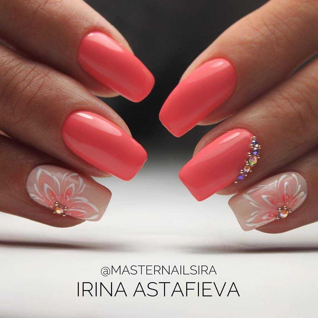 Помимо классического расположения в прикорневой зоне можно выполнить растяжку стразами на белом фоне, заполнить стразами и бульонками все пространство безымянного пальца. Белый и коралловый отлично смотрятся с флористикой. Используйте стразы для акцентирования сердцевинки цветов, для декора лепестков, имитации росы.