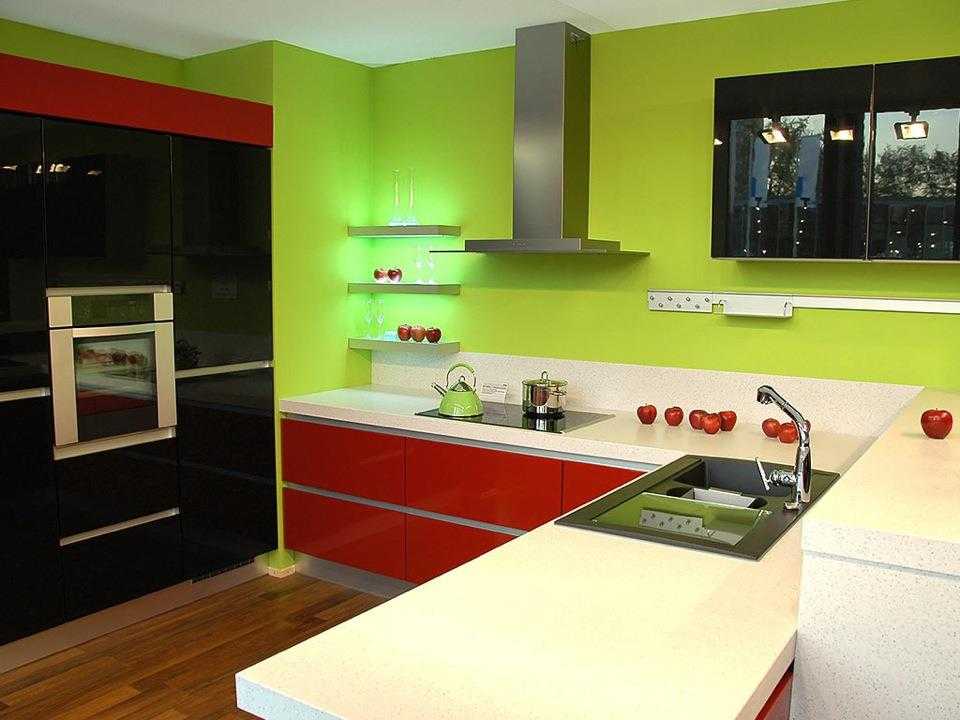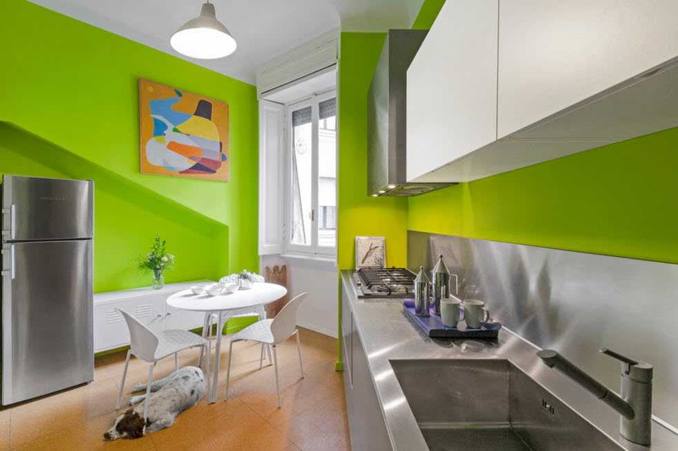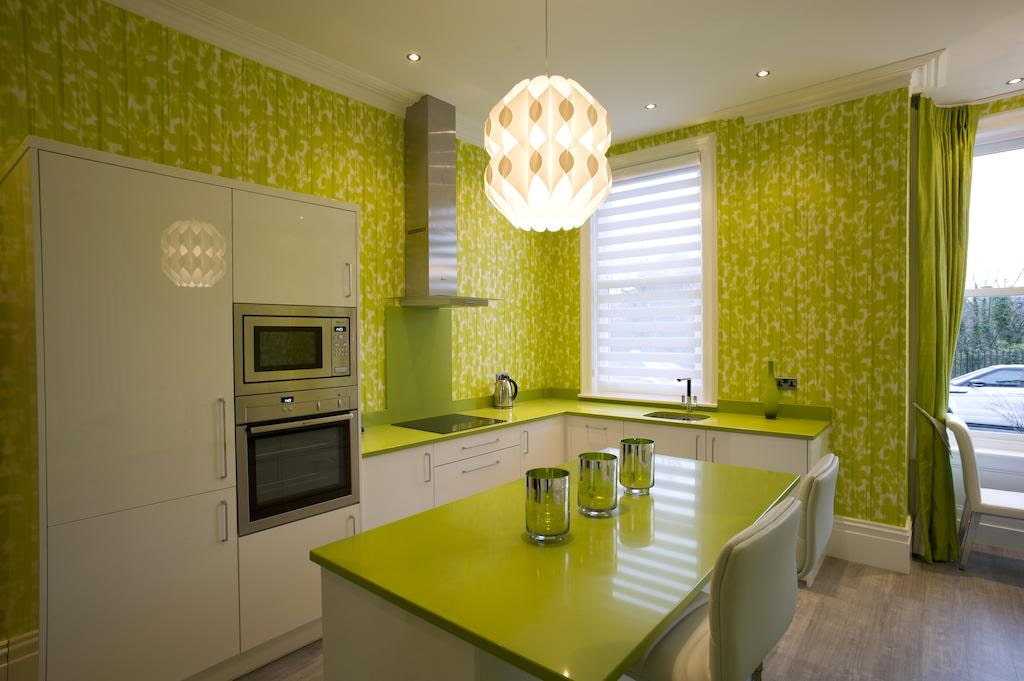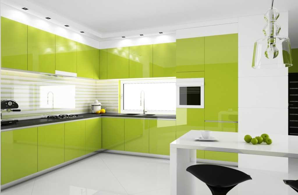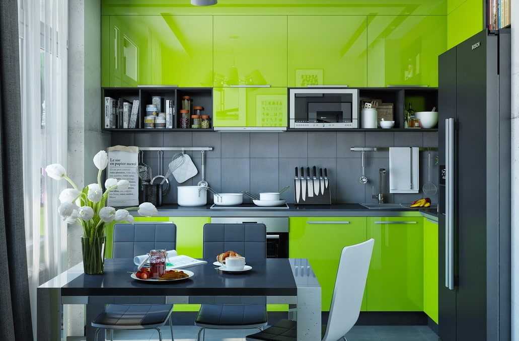 Салатовые оттенки чаще всего используются в качестве акцентов в интерьере, так что нужно чётко определить для себя цветовую гамму, в избежание цветовой перегрузки. Если вы решите сделать акцент на стены, то есть возможность удачного сочетания их с фактурными решениями и минималистичным интерьером. Интересно будет смотреться и яркий зелёный фасад в сочетании с нейтральными цветами рабочей поверхности.