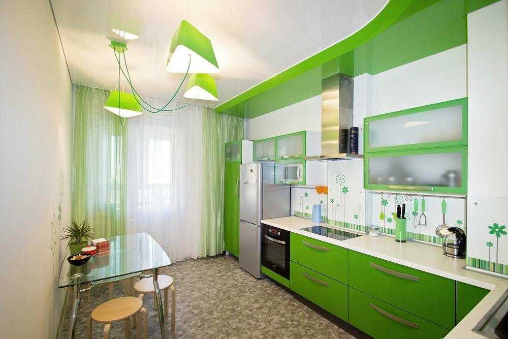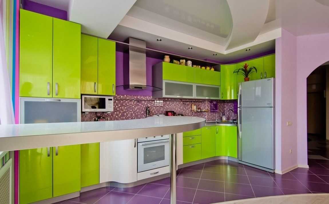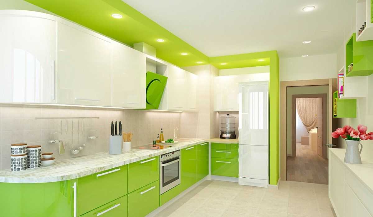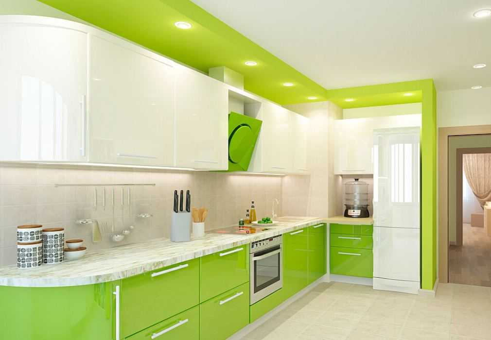 Салатовые оттенки чаще всего используются в качестве акцентов в интерьере, так что нужно чётко определить для себя цветовую гамму, в избежание цветовой перегрузки. Если вы решите сделать акцент на стены, то есть возможность удачного сочетания их с фактурными решениями и минималистичным интерьером. Интересно будет смотреться и яркий зелёный фасад в сочетании с нейтральными цветами рабочей поверхности.