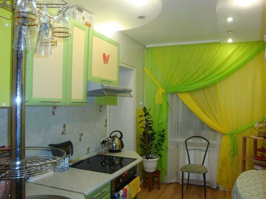 Для маленькой кухни наиболее удачным вариантом будут короткие шторы актуального пастельного оттенка – серо-зеленого, желтого, серо-бежевого, пыльно-розового.