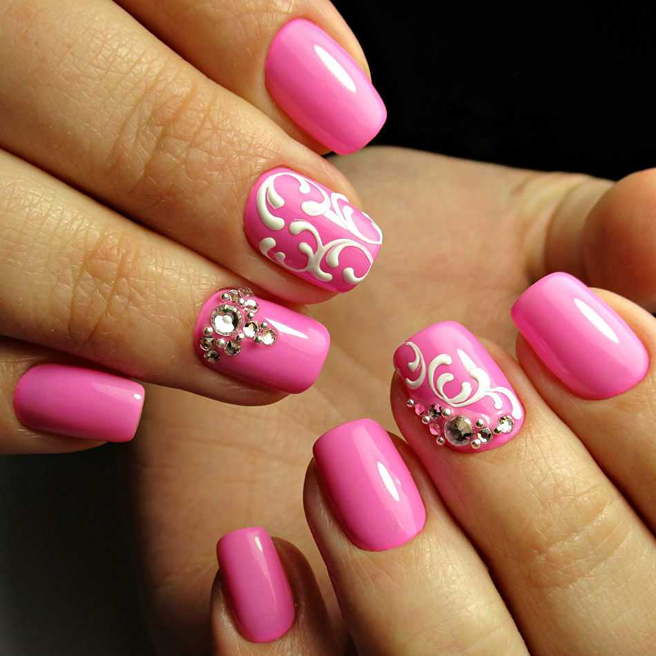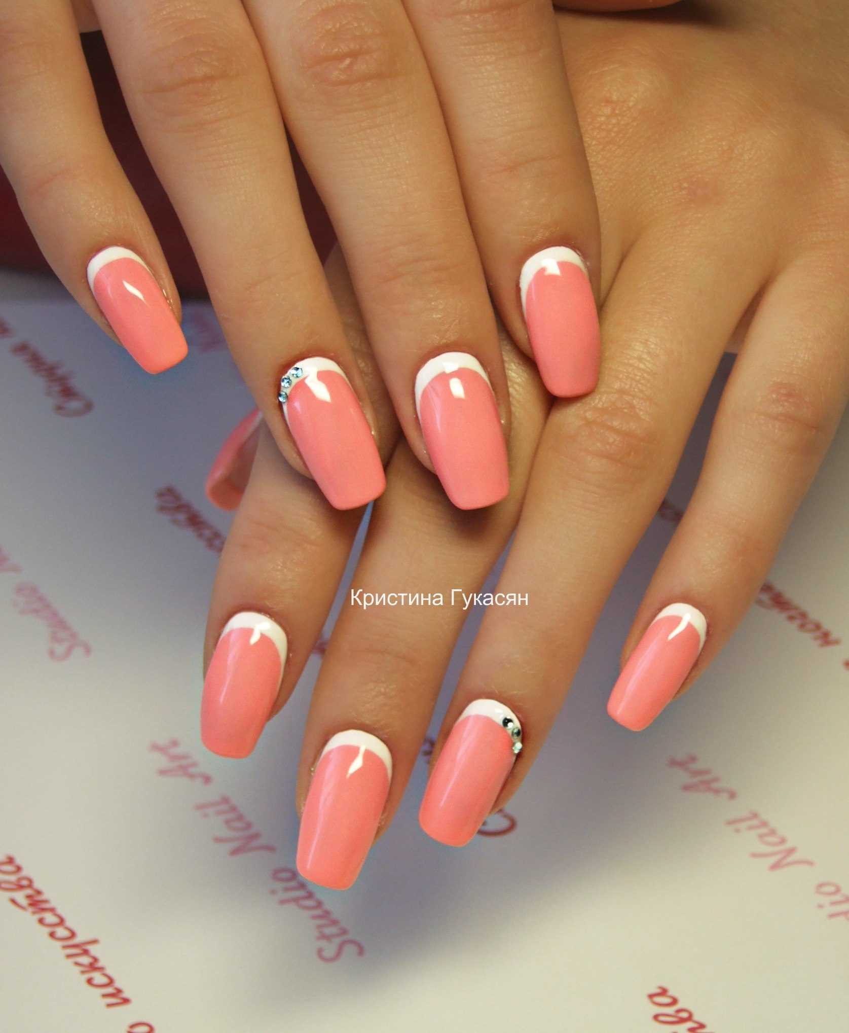 Используйте стразы помельче, при желании замените их на бульонки. На коротких ногтях можно использовать яркий коралловый цвет либо нежные оттенки с белым подтоном. Что касается техник маникюра, то на коротких ногтях стильно смотрится однотонное покрытие, французский и лунный маникюр, сочетание кораллового цвета с белым.