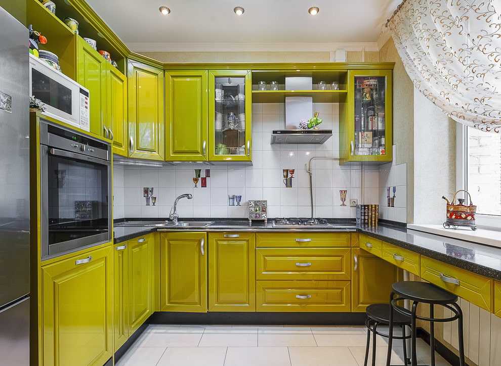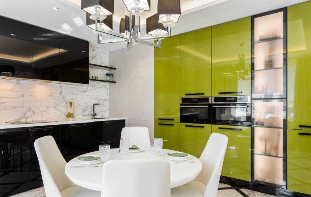 Если дизайнер решил, что кухня должна источать энергию весны и давать заряд пробуждения, свежести или новых идей, тогда салатовый будет отличным решением.