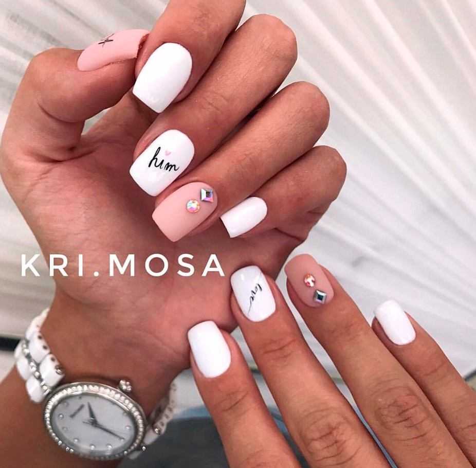 Сочетание кораллового и белого смотрится очень нежно и женственно. Мягкий коралловый оттенок дополняется безупречным белым цветом и позволяет создать десятки интересных однотонных и сложных нейл-артов. Особенно актуальна эта цветовая палитра для обладательниц коротких ногтей. Оба цвета смотрятся на коротких ногтях мягко и сдержанно. Что касается дизайна стразами, то тут можно поэкспериментировать.