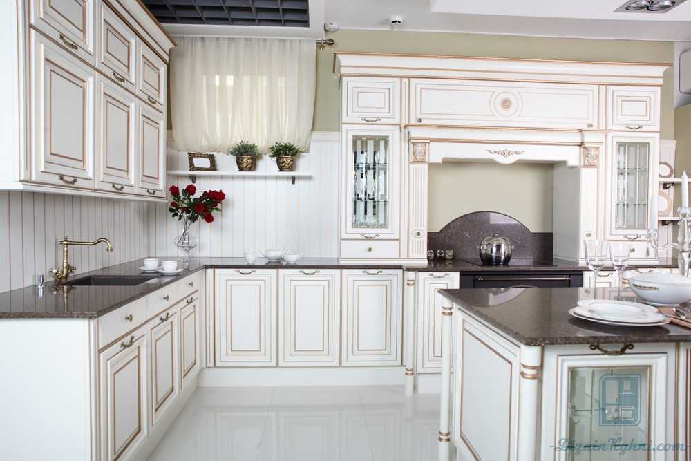 Все те же арки и высокие потолки, но цвета чаще светлые, без ярких акцентов, а еще добавляется показная роскошь: лепнина, зеркала в тяжелых рамах, классические картины, громоздкая мебель, металлические люстры с хрустальными элементами. Желательно скульптуры, статуэтки и фарфор, чтобы завершить картину.
