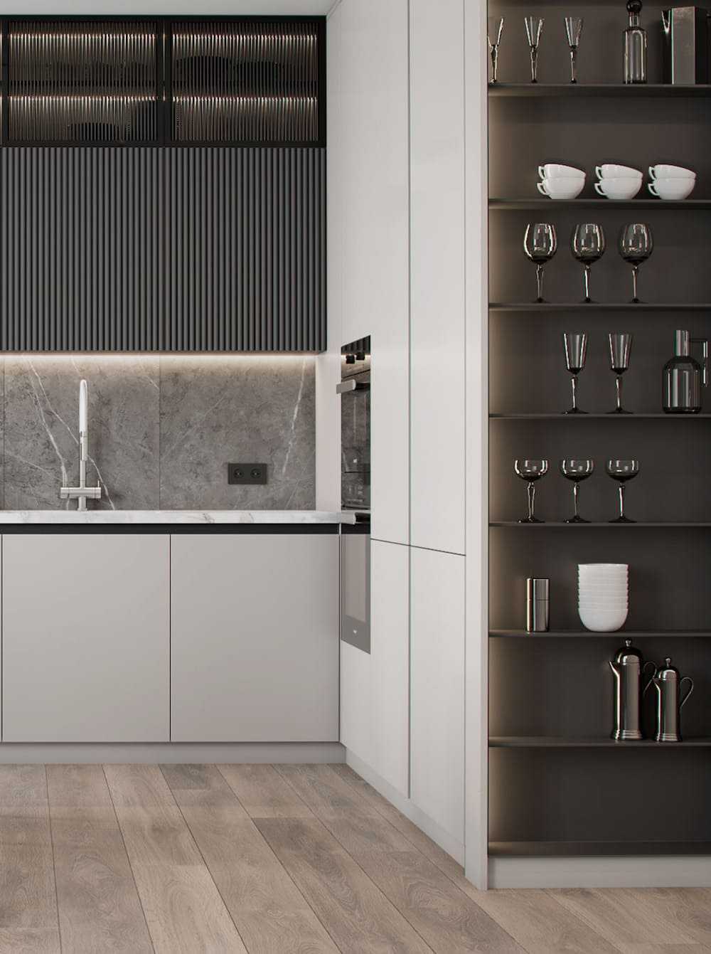 Часто на них присутствует позолота либо другая инкрустация. Главная функция стеклянных стенок – продемонстрировать гостям кухни расставленную на полках дорогую, нередко антикварную посуду