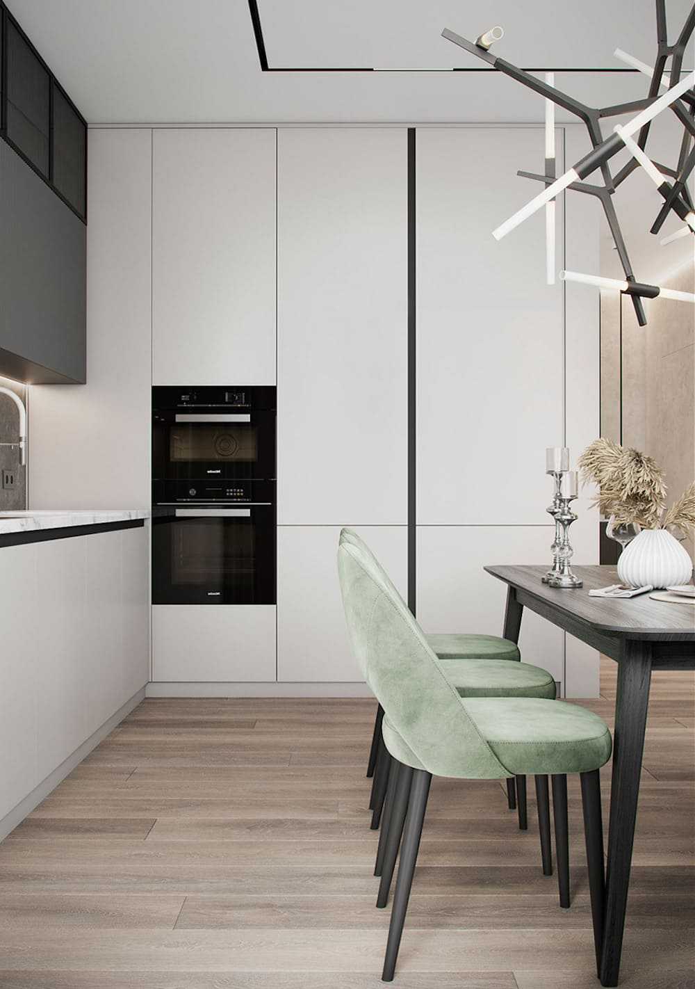 Справиться с проблемой недостатка места помогут современные механизмы, выдвижные системы и высокие вертикальные ящики. Идеально, если дверцы навесных шкафов будут открываться не обычным способом (в сторону), а вверх, тогда полезное пространство останется свободным.