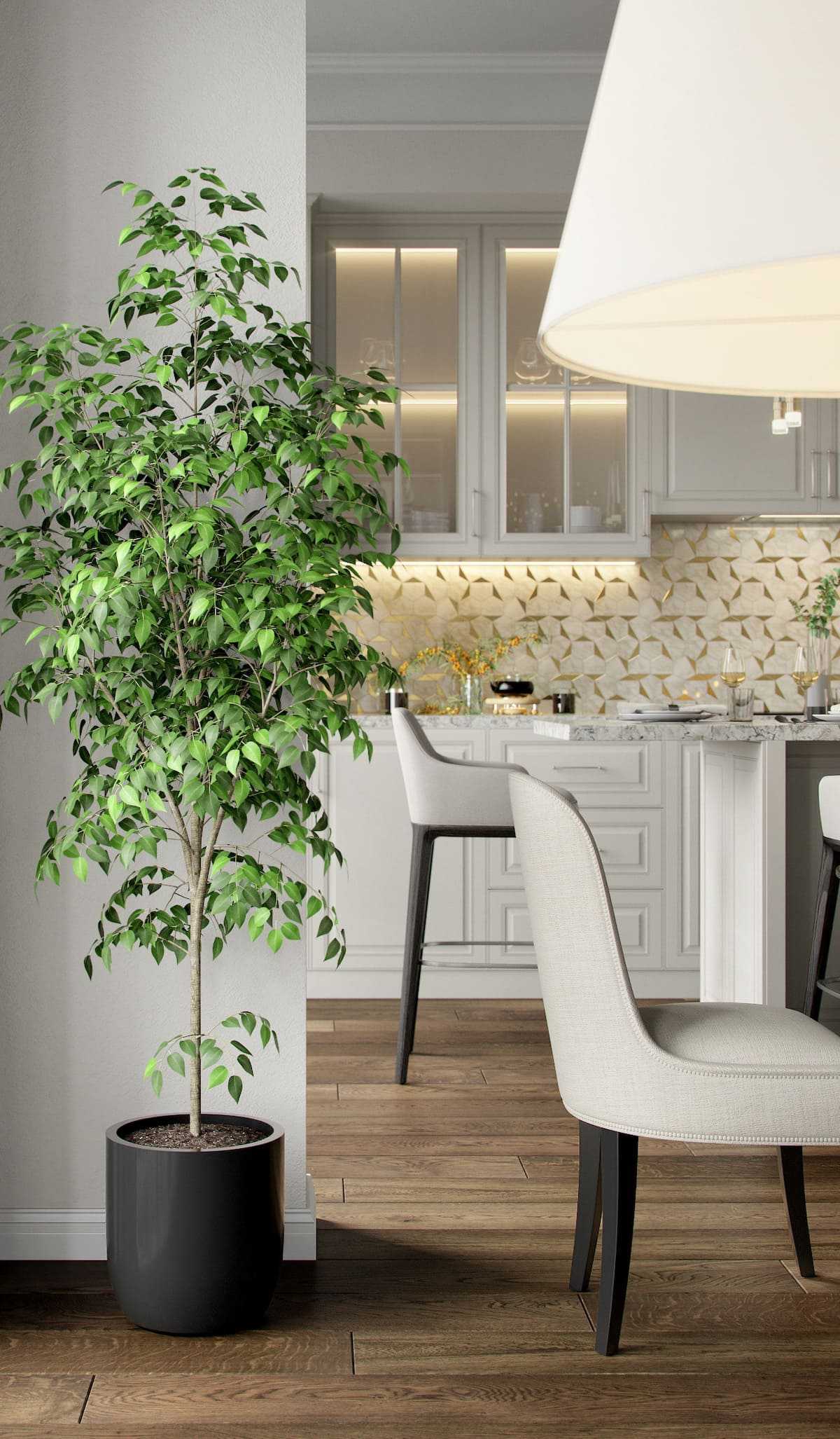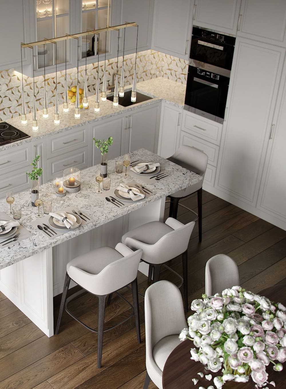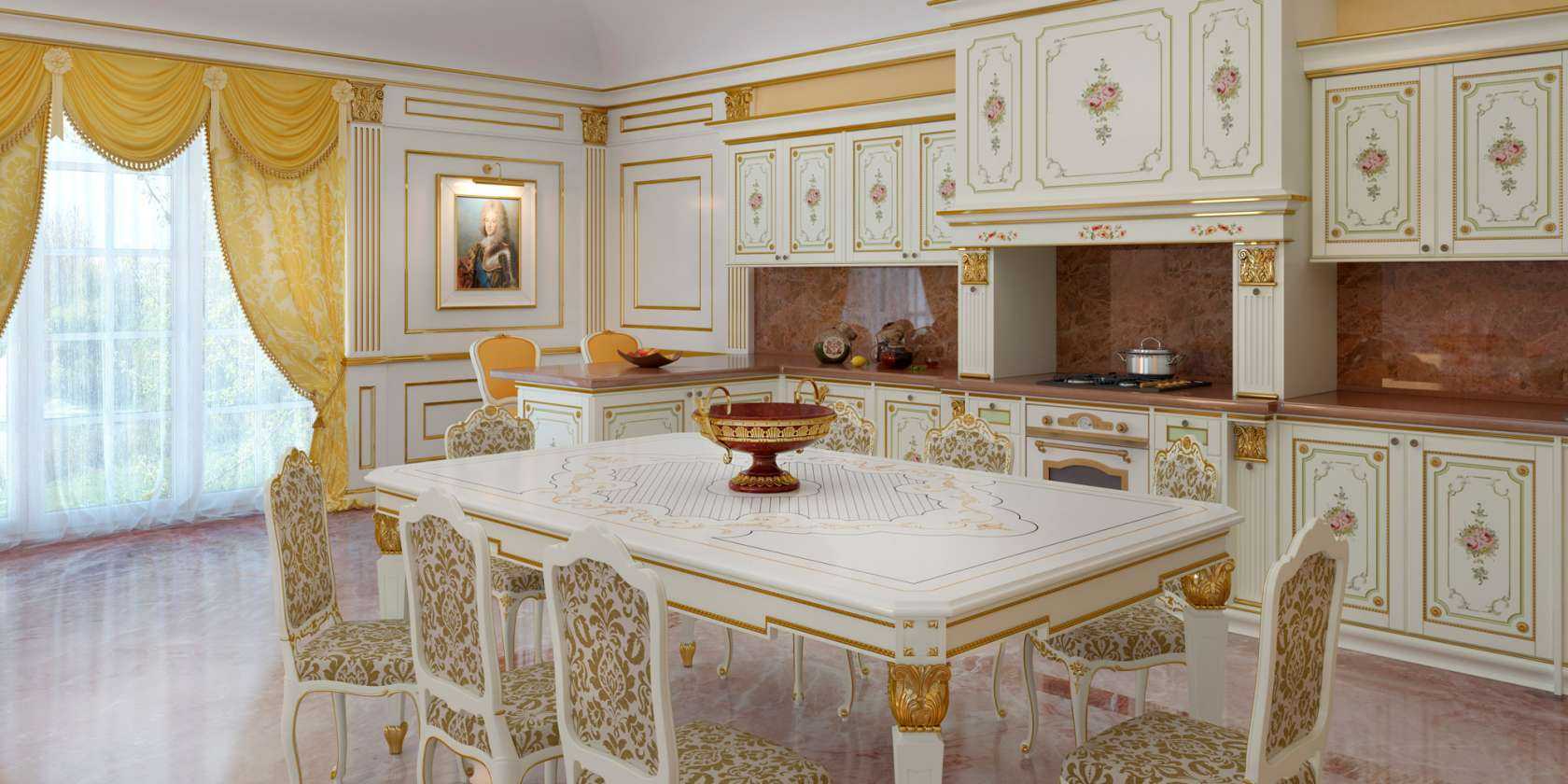 В отделке также рекомендуется использовать натуральное дерево, мрамор или кафельную плитку под камень/мрамор. Подчеркнуть помпезность антуража помогут вышитые вручную салфетки, белая скатерть, большая люстра в обеденной зоне, вазы с живыми цветами.