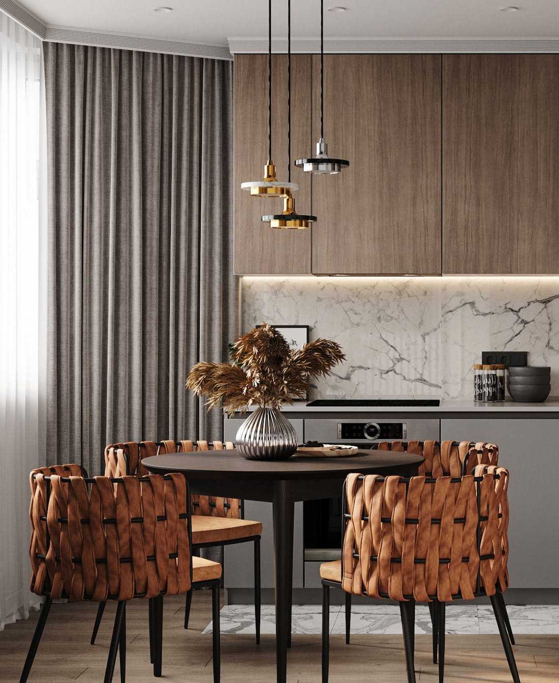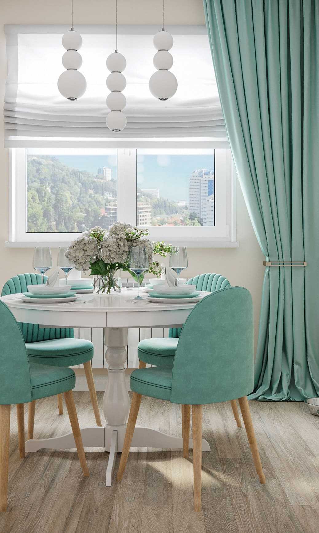 Массивные портьеры прекрасно подходят для кухонь, объединенных с гостиными. Занавеси часто драпируют, декорируют ламбрекенами. Цветовая гамма штор подбирается в тон мягкой мебели.