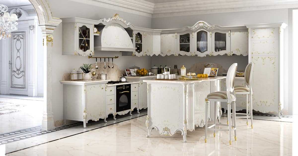 Кухонную мебель для стиля ампир выполняют преимущественно в светлых тонах