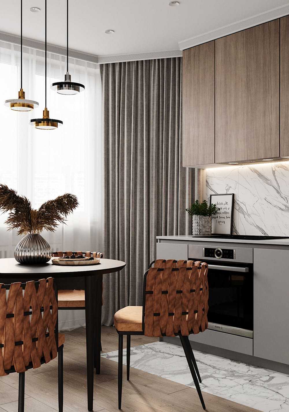 - Любой интерьер подбирается в зависимости от особенностей планировки кухни.