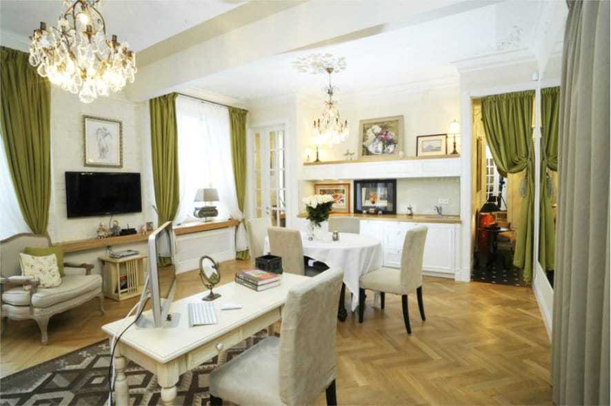 Интерьер в стиле кафе отлично сочетается с совмещенной планировкой. Зоны кухни и гостиной можно разделить с помощью барной стойки или арки. Иногда барная стойка может помещаться прямо в полуарке или быть частью перегородки, что подходит для небольших квартир.