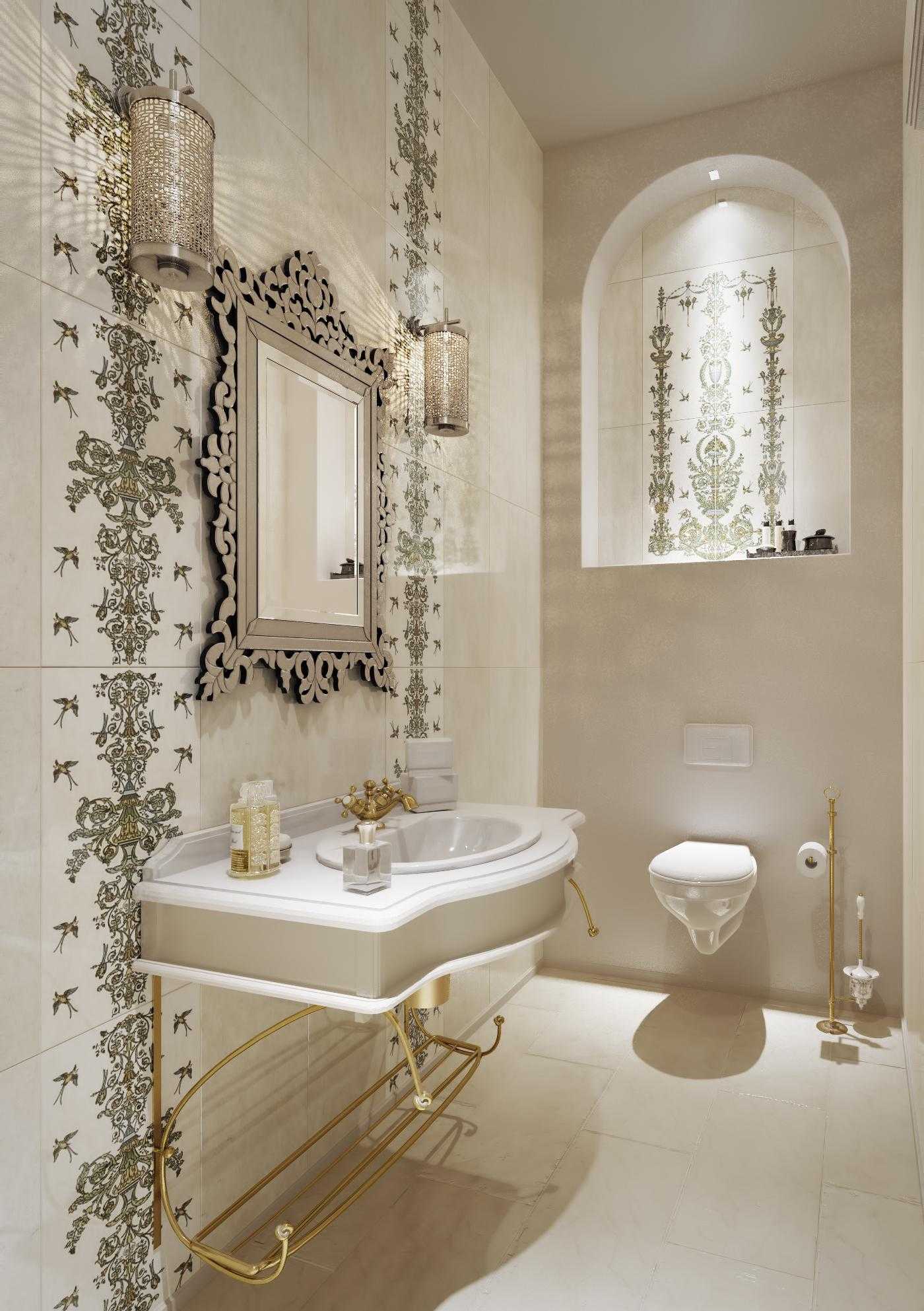 В марокканском направлении можно встретить интерьеры, где роль бежевого цвета ложится на гарнитур, резные детали которого превосходно сочетаются с голубизной облицовки. Для Страны восходящего солнца такая гамма наиболее свойственна. Причем стены могут оформляться в более темных тонах, чем нижние и верхние перекрытия – это добавляет геометрического своеобразия. Бежевая плитка с коричневым национальным орнаментом отлично охарактеризует арабский тип.