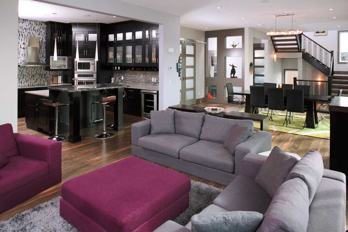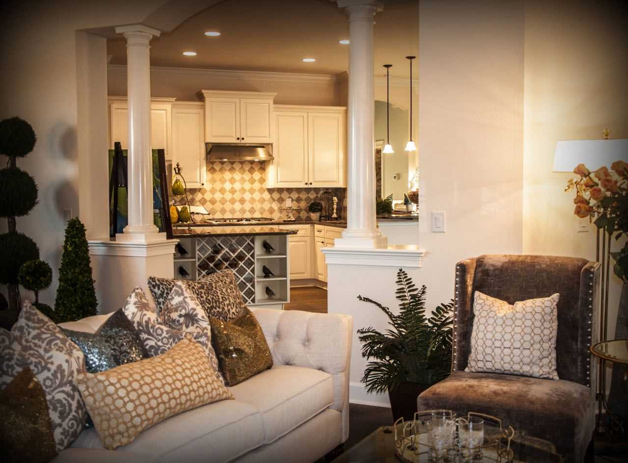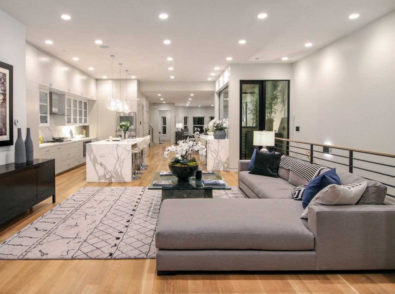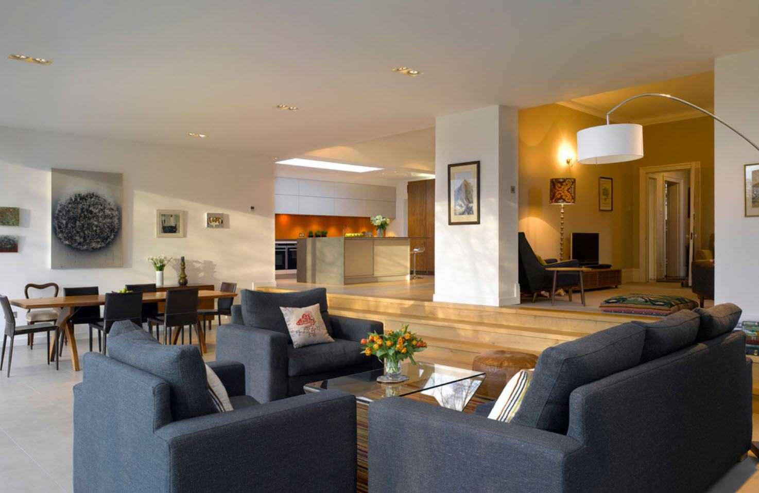 Существует много элегантных и творческих способов разделить или, точнее, создать символическую границу между кухней и жилыми помещениями, фактически не используя разные комнаты со стенами и дверями. Одним из модных подходов в современном дизайне является подъем одной из зон. Другим часто используемым вариантом для разделения между зоной приготовления пищи и гостиной в открытом помещении является стеклянная перегородка — модная и функциональная ловкость, которая дает определенную конфиденциальность между двумя зонами. Шум и запахи из кухни не попадают в гостиную.