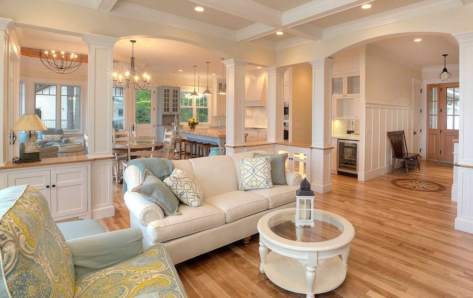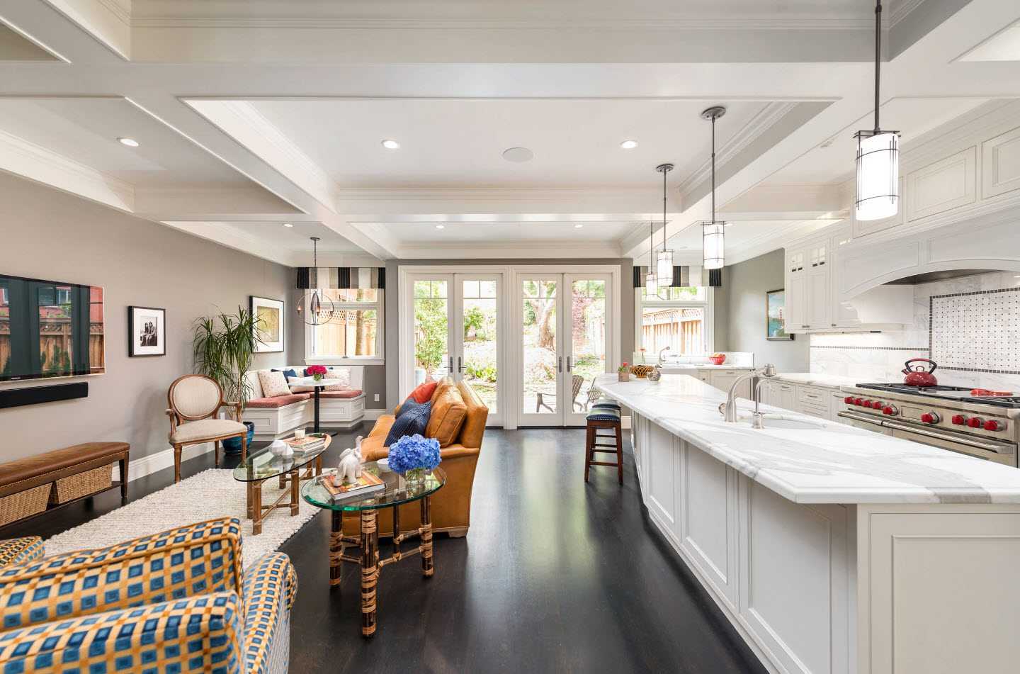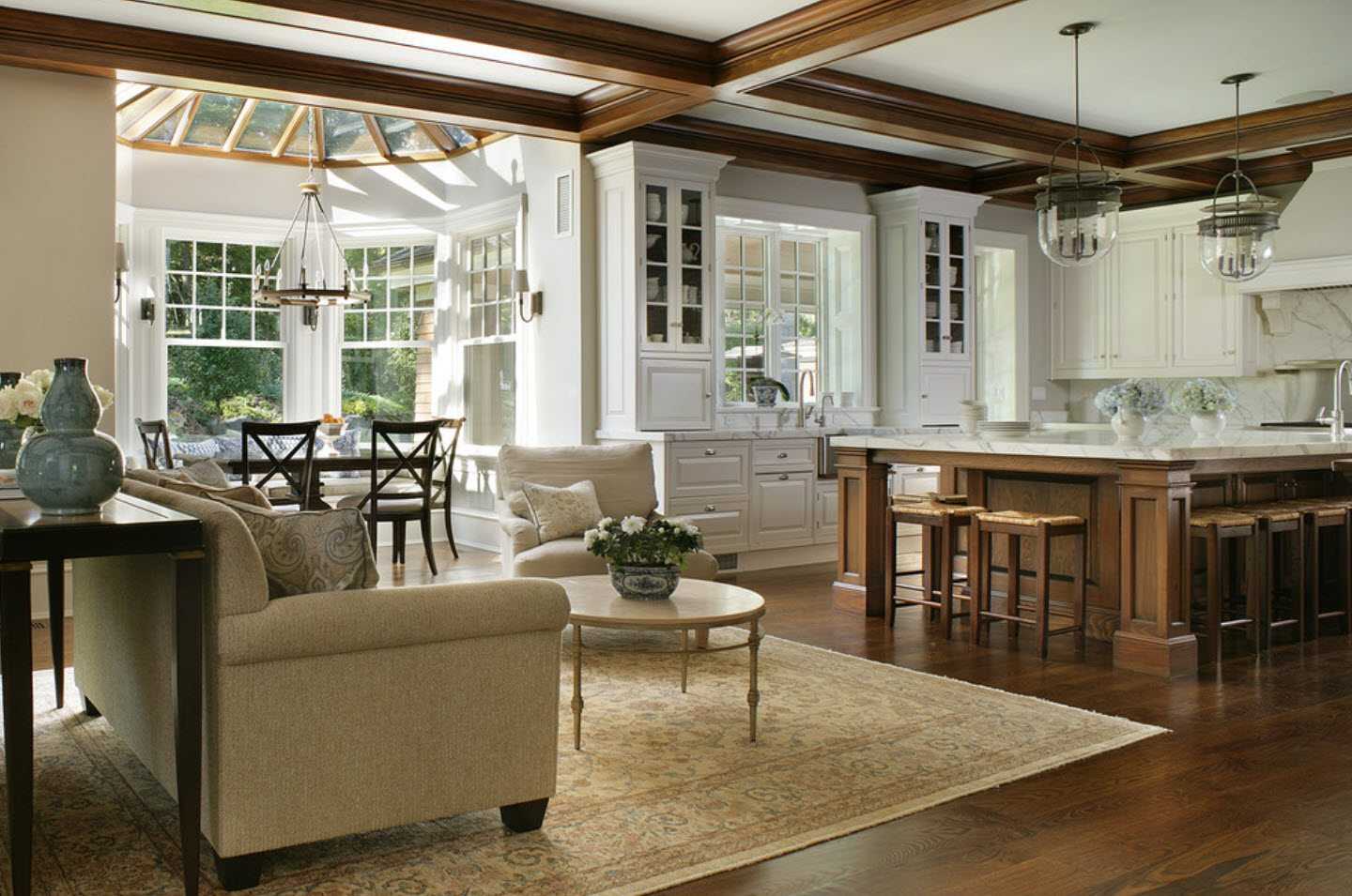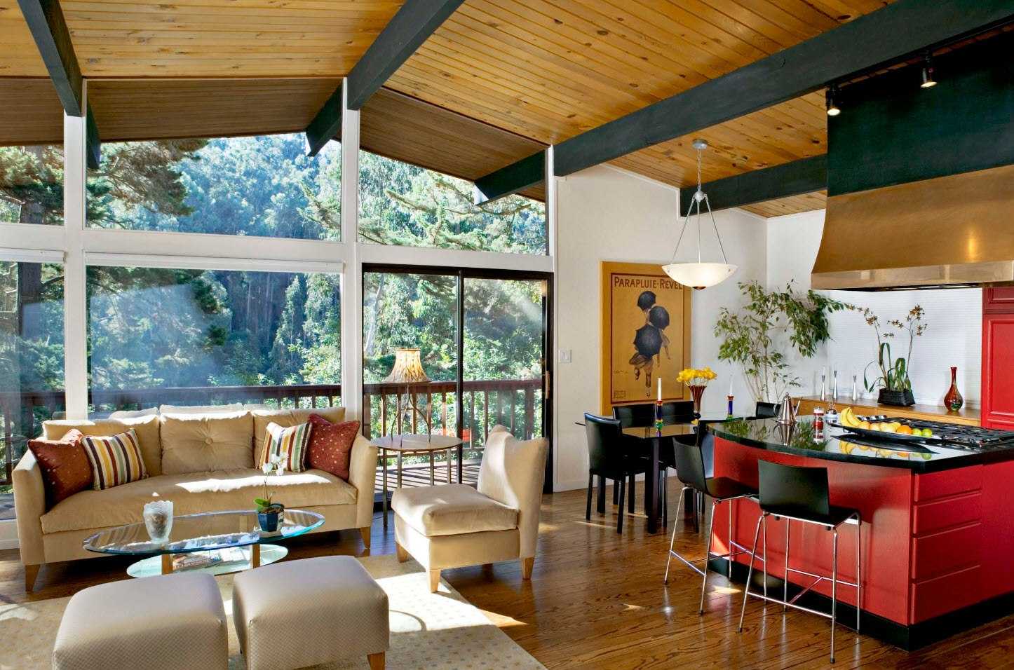 Существует много элегантных и творческих способов разделить или, точнее, создать символическую границу между кухней и жилыми помещениями, фактически не используя разные комнаты со стенами и дверями. Одним из модных подходов в современном дизайне является подъем одной из зон. Другим часто используемым вариантом для разделения между зоной приготовления пищи и гостиной в открытом помещении является стеклянная перегородка — модная и функциональная ловкость, которая дает определенную конфиденциальность между двумя зонами. Шум и запахи из кухни не попадают в гостиную.
