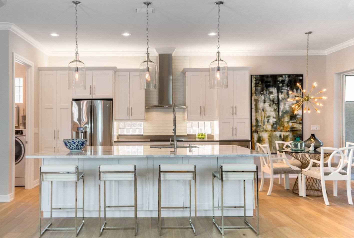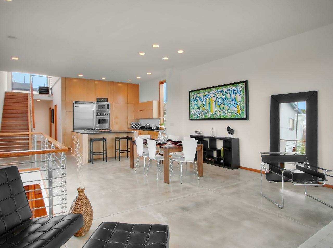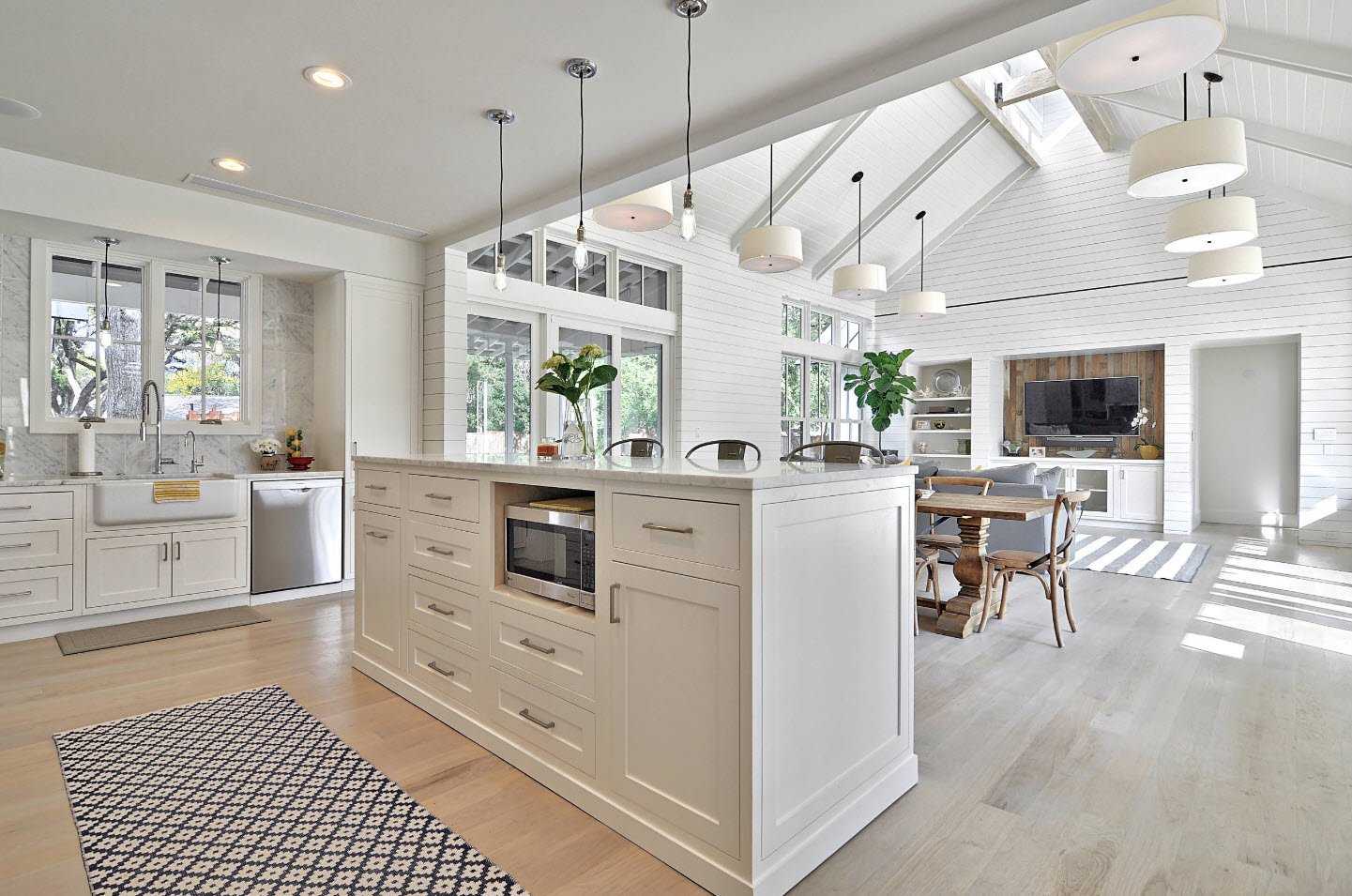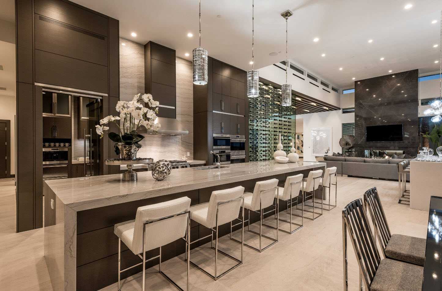 Идея открытой кухни вовсе не необычна, особенно в случае современных домов. В настоящее время тенденция состоит в том, чтобы сделать интерьер максимально свободным и упростить структуру и декор, не жертвуя функциональностью. Именно поэтому устранение барьера между кухней и гостиной является практичным шагом. Чаще всего кухня связана с обеденной зоной и смежной гостиной. Обеденный стол обычно становится буферной территорией между участками комнаты.