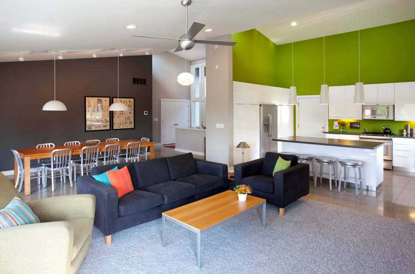 Чтобы разделить комнату на несколько зон при помощи одной цветовой гаммы, используются разные по насыщенности оттенки. Например, кухня может быть на тон светлее столовой, а зона отдыха, в свою очередь, на тон темнее. При контрастном разделении интерьера на несколько областей хорошо смотрятся сочетания белого с оливковым, серебристо-серого с зелёным, ванили с шоколадным цветом.