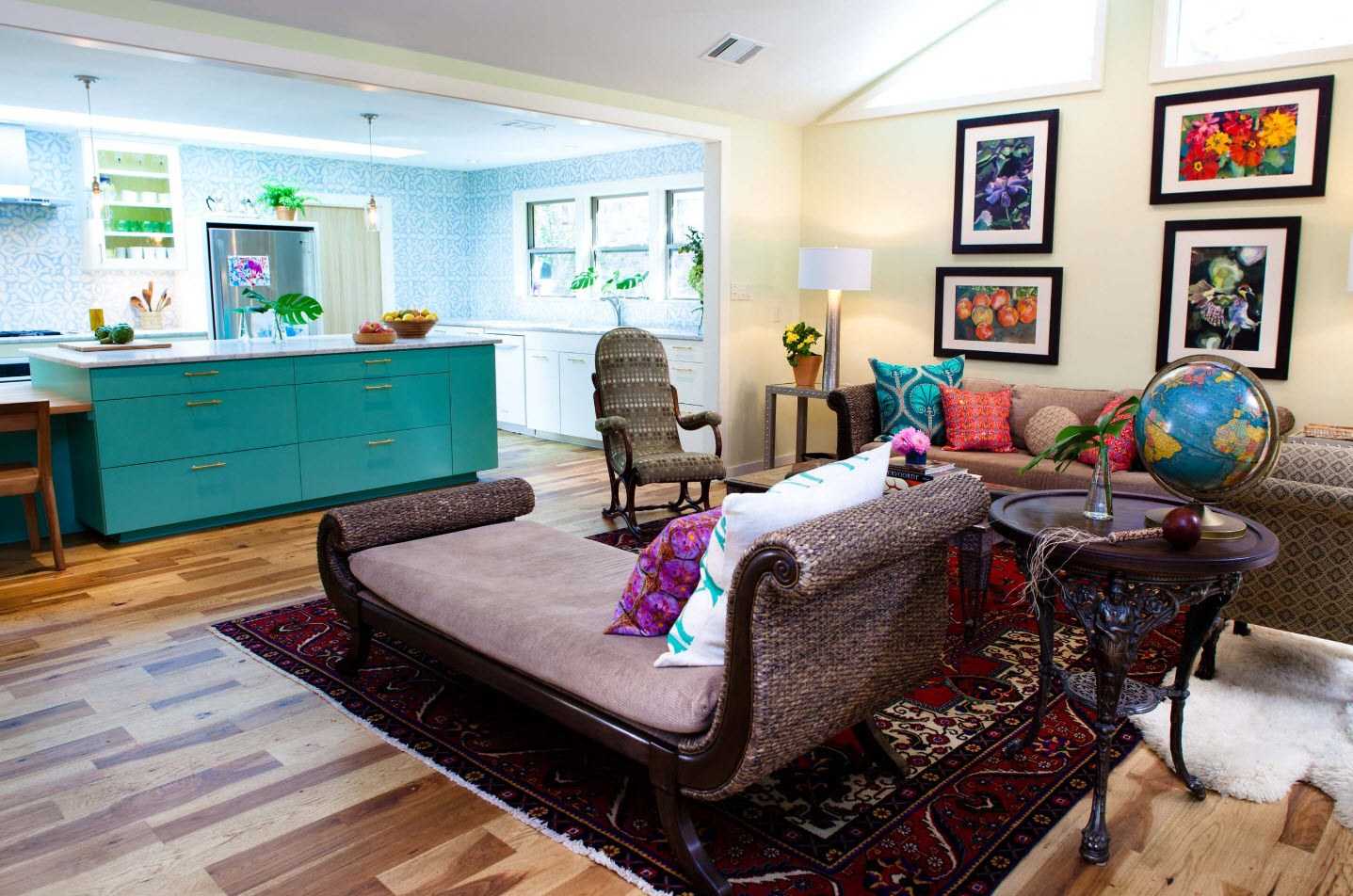 Пространство «кухня-гостиная» не ограничивает своих владельцев в выборе стиля и цветов.