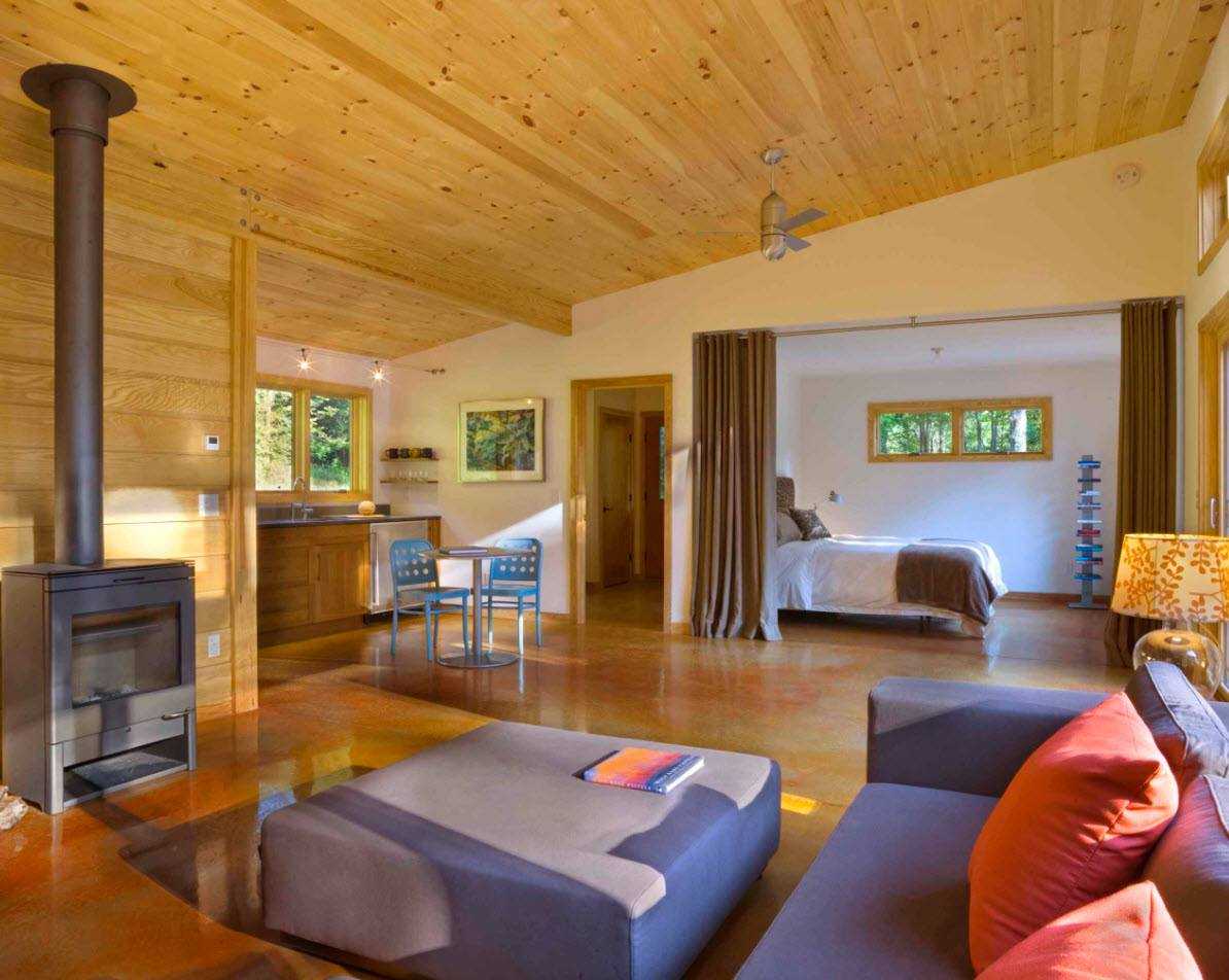 - Для такого помещения идеальным вариантом станет сочетание древесины со светлыми оттенками. Светлые цвета разбавляют тёмными оттенками, но лучше не использовать в зоне гостиной чёрный цвет.