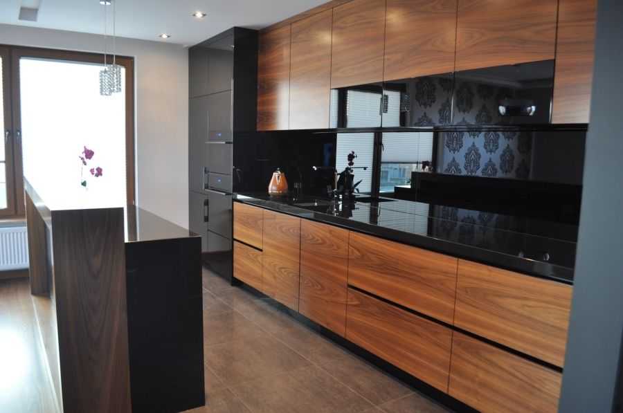 Как мы уже отмечали, в случае, если применяются классические темные-черные кухонные гарнитуры и мебель, чаще всего используют глянцевые и зеркальные поверхности, чтобы подчеркнуть все изящество общей конструкции.