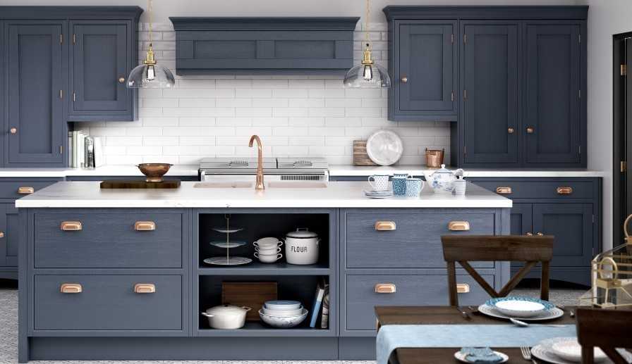 Яркие кухни и яркие узоры — это, безусловно, по-прежнему актуально для кухни и в 2019. На примере выше — синие фасады, которые встретишь далеко не в каждой кухне, которые подчеркиваются использованием узорно-треугольной плитки сине-белой расцветки.