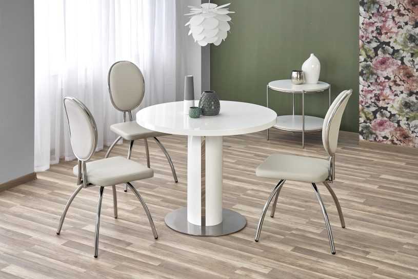 Столы в столовой могут быть намного больше, чтобы разместить семью на ужин или во время приема гостей. Размеры, стили и функции различны, поэтому выбор часто будет сложным, но и приятным. При выборе кухонного стола убедитесь, что он соответствует стилю другой мебели. Сегодня ассортимент настолько велик, что вы можете легко подобрать правильную модель. Интересным вариантом является раскладной стол круглой формы. Это предмет мебели в современном стиле, который идеально подойдет к интерьеру, оформленному в инновационной аранжировке. Белая столешница и светлые ножки придают интерьеру яркость.