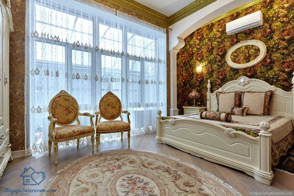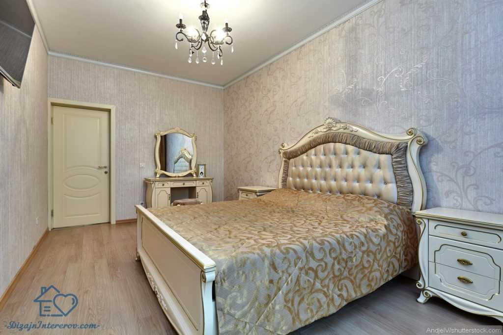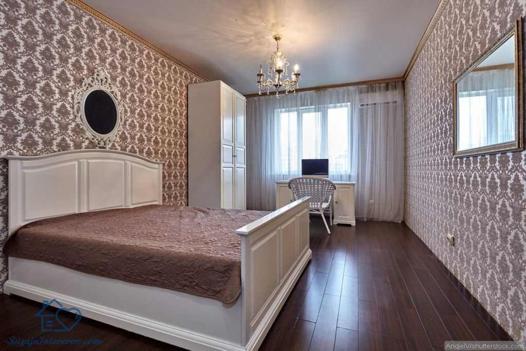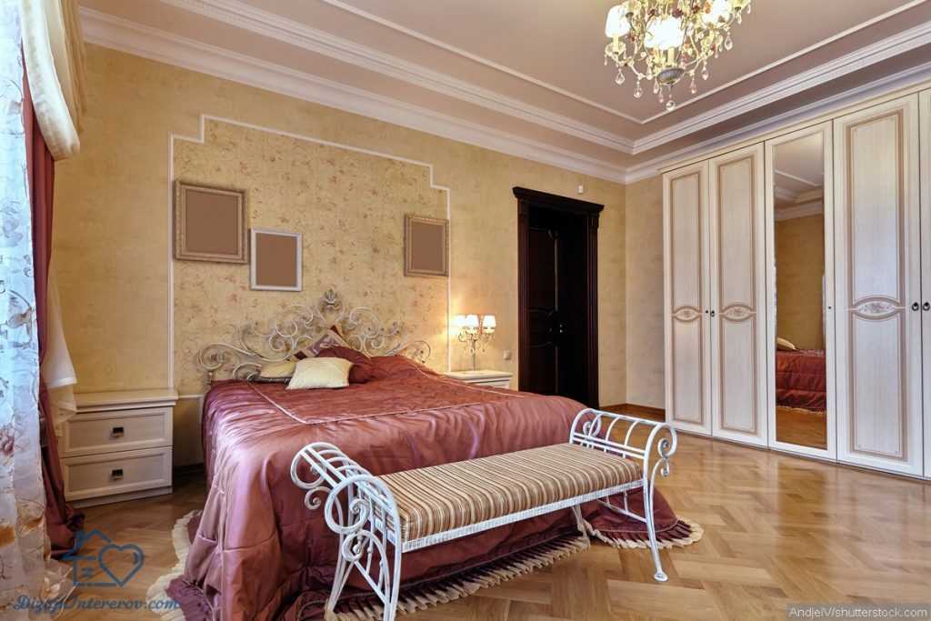 - Спальням классического стиля подойдут обои теплых оттенков с золотым или серебряным узором. Обои с рельефной поверхностью могут сочетаться с другими декоративными элементами отделки, что придаёт комнате роскошный и изысканный вид.