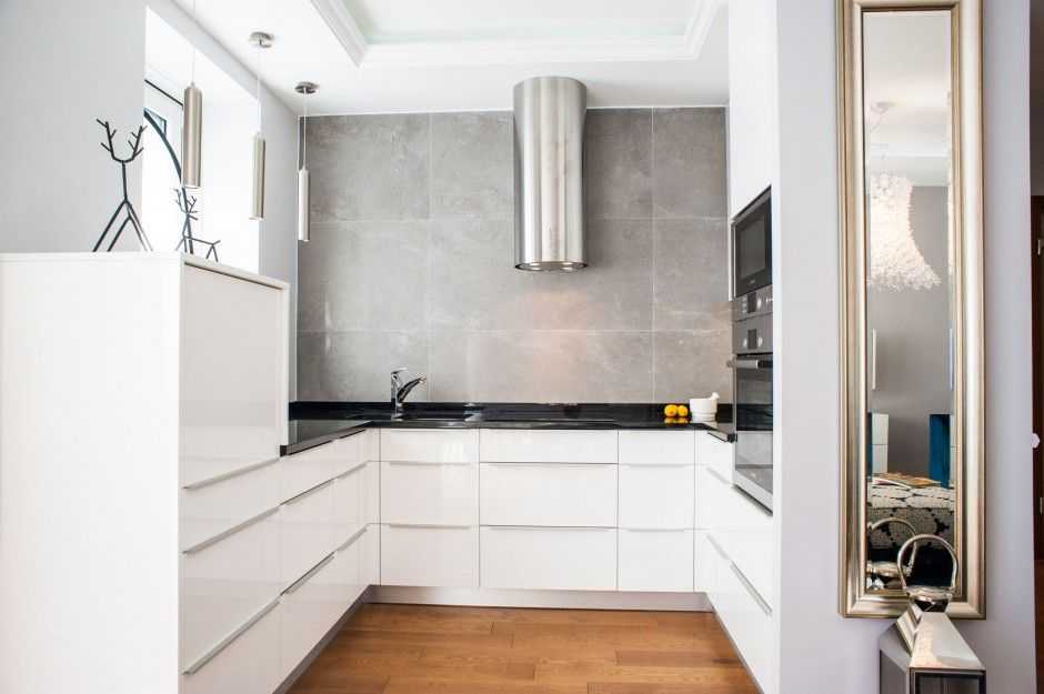 На серо-белой кухне цвета стен и потолка должны быть яркими. Светлый потолок оптически увеличит его и добавит блеска освещению. В свою очередь, серый потолок приведет к тому, что комната визуально опустится, а кухня покажется перегруженной. Темный потолок могут выбрать люди, которые имеют высокий уровень потолка.