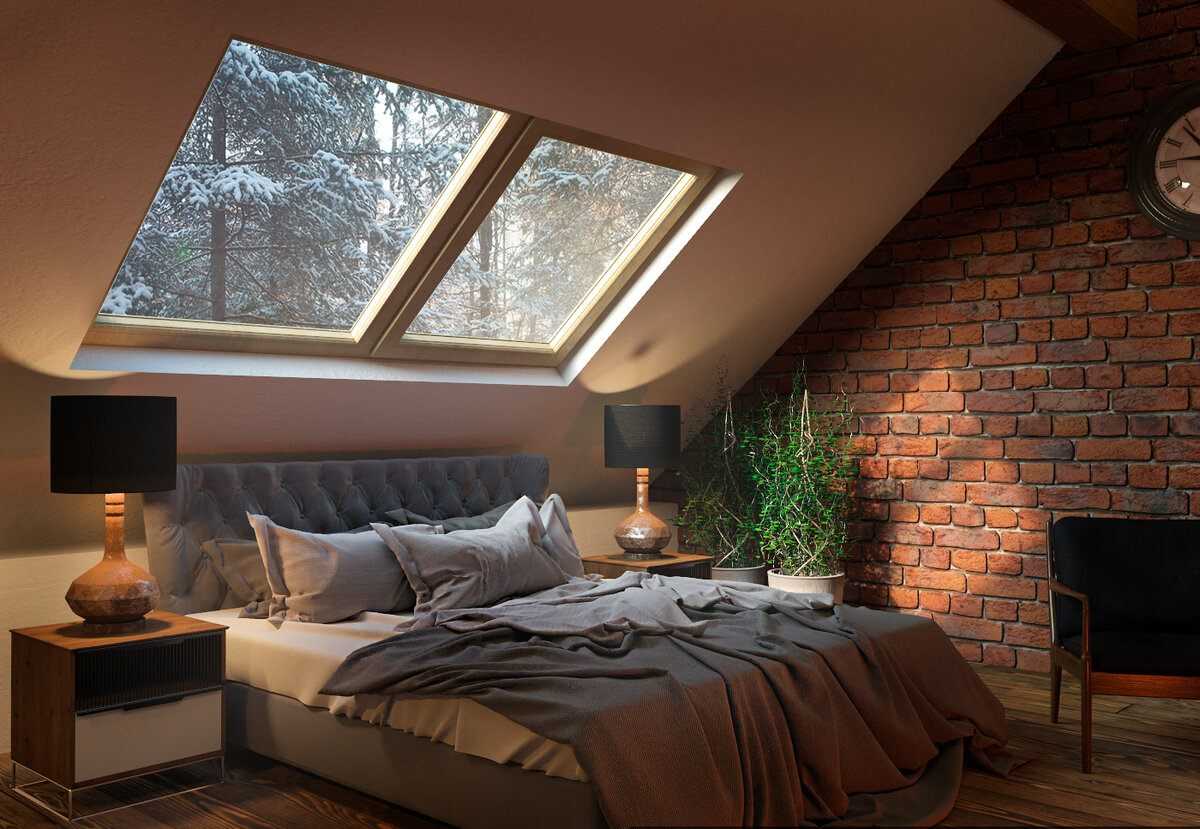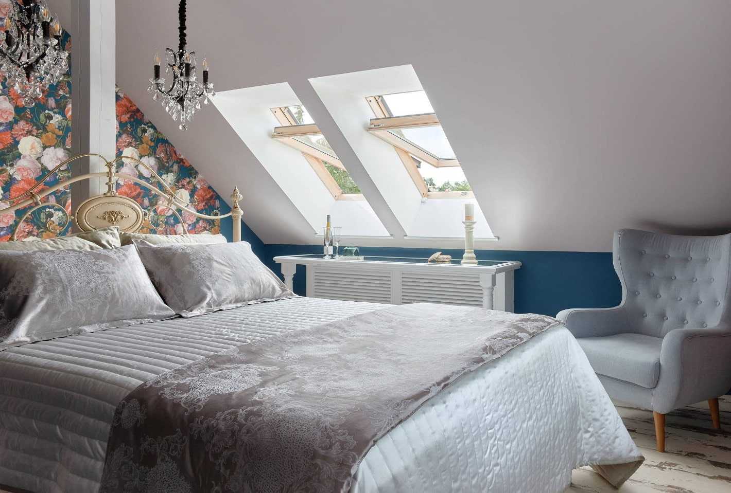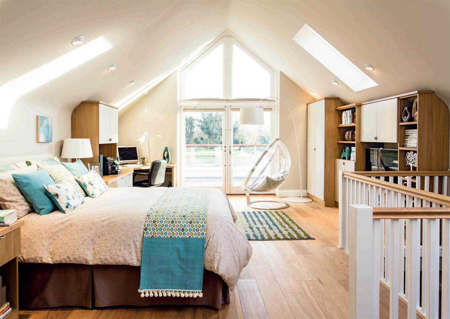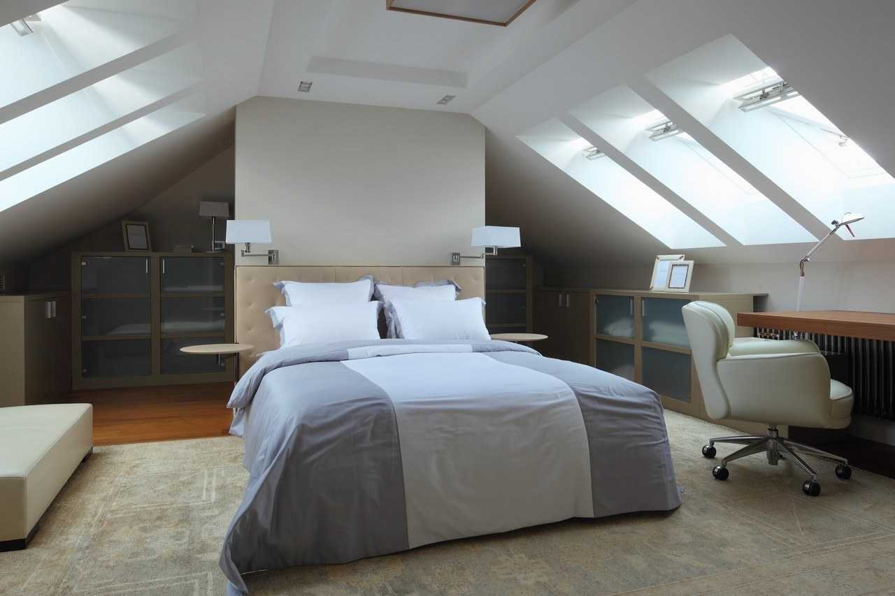 Количество и тип выбираемых на чердак светильников зависит от формы, размера и расположения окон. Этот фактор влияет также на выбор мебели и цветовой гаммы спальни.