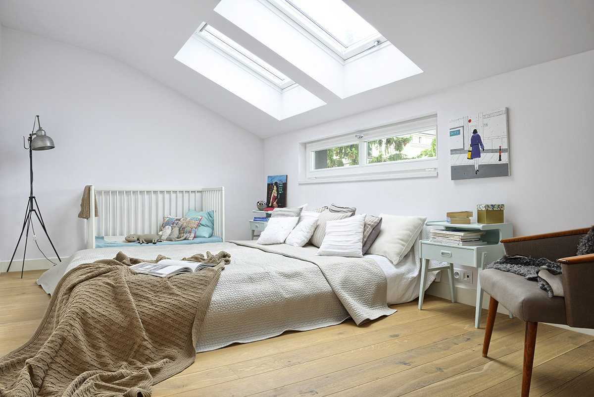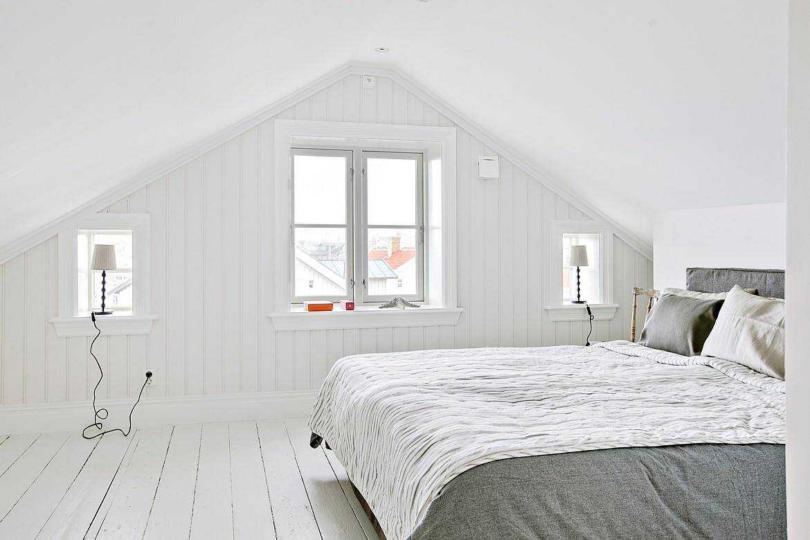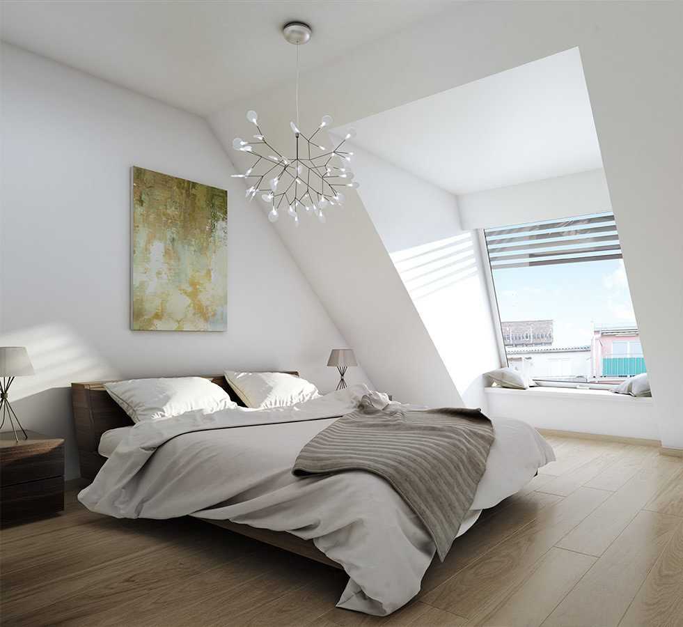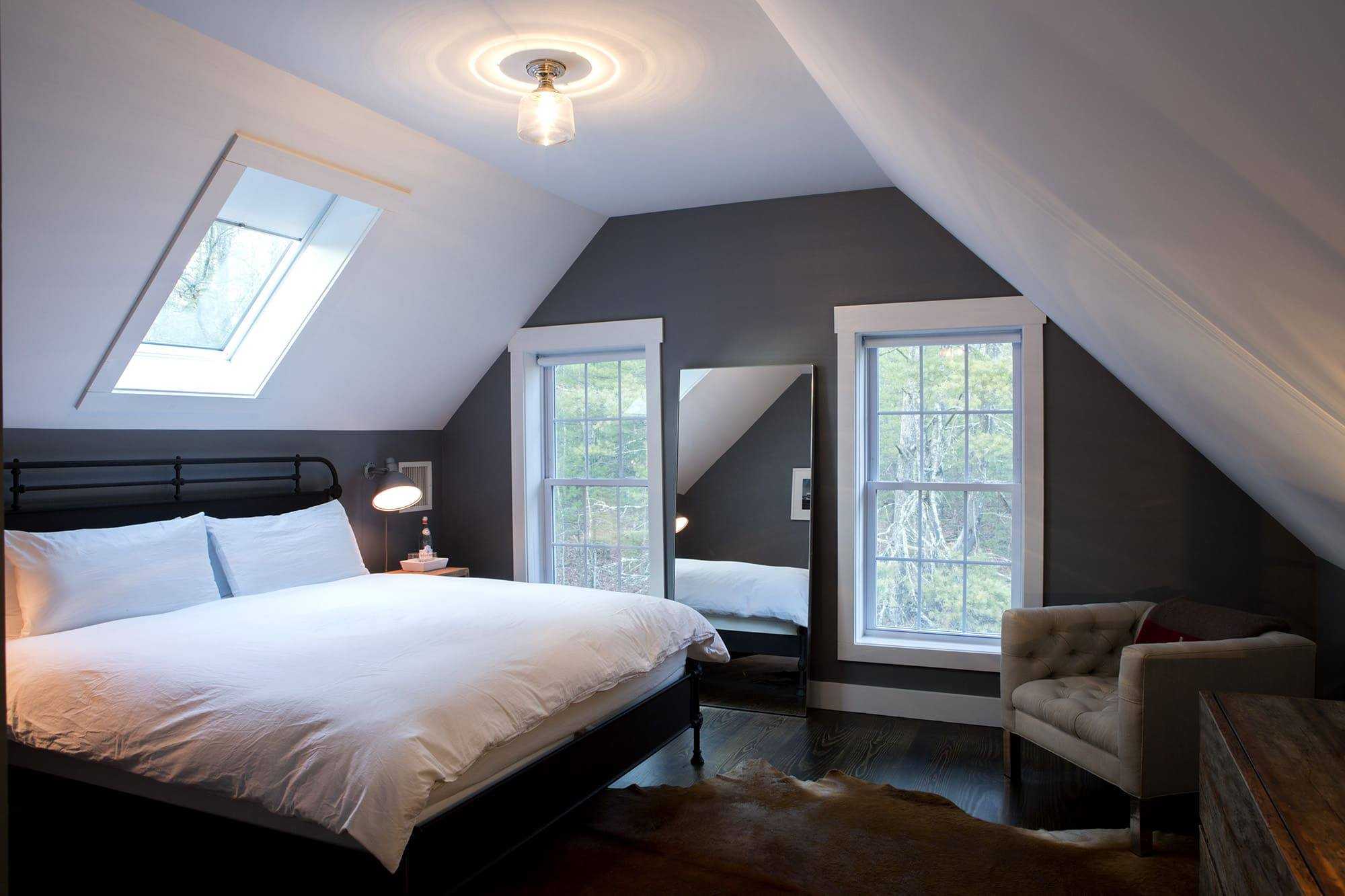 Количество и тип выбираемых на чердак светильников зависит от формы, размера и расположения окон. Этот фактор влияет также на выбор мебели и цветовой гаммы спальни.