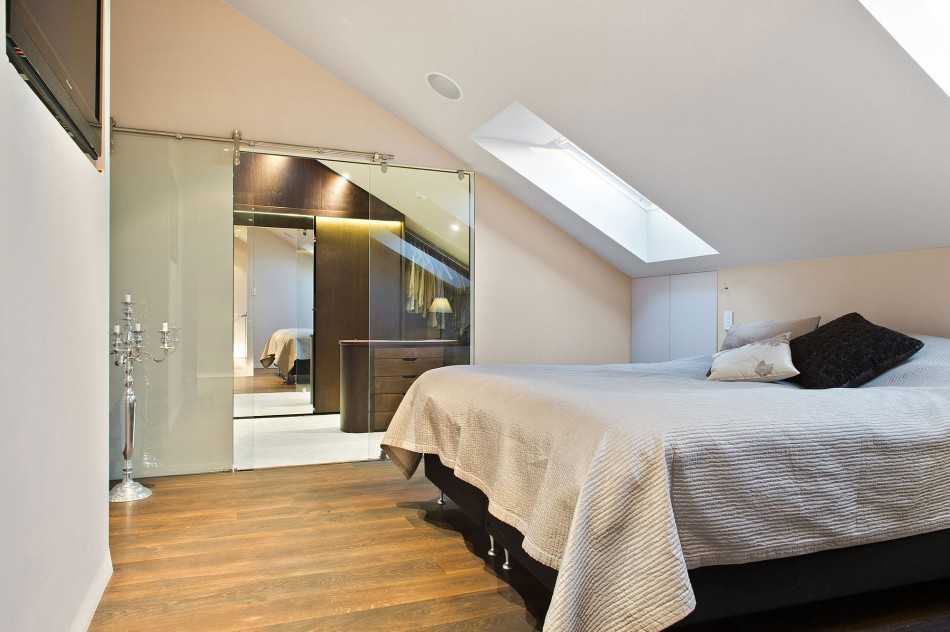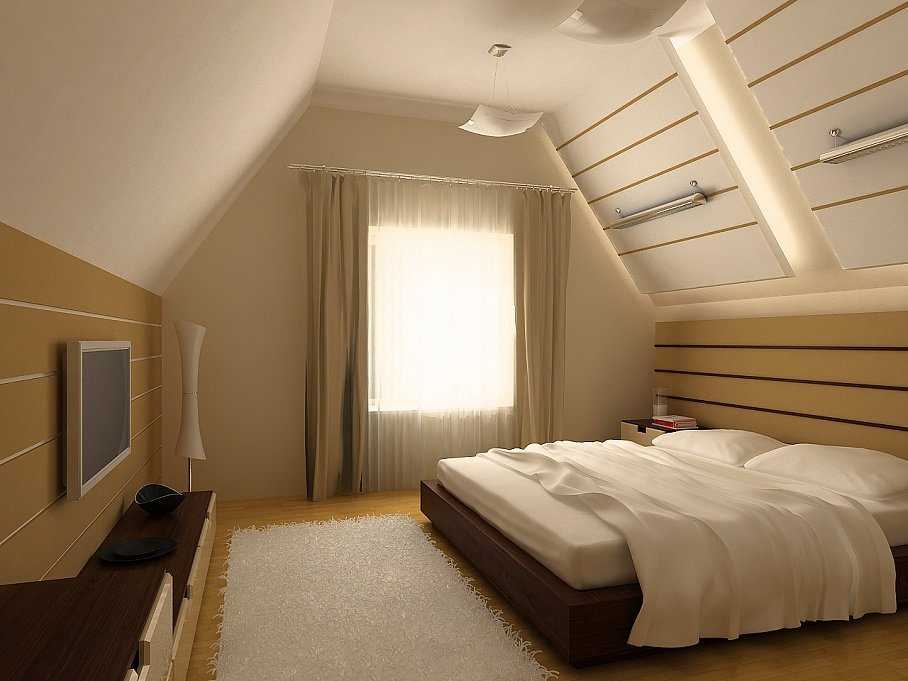 Спальня – наиболее оптимальное решение для подобного помещения. В ней вы отдыхаете, то есть проводите время в горизонтальном положении. Поэтому скатная кровля не станет помехой для комфортного пребывания в комнате.