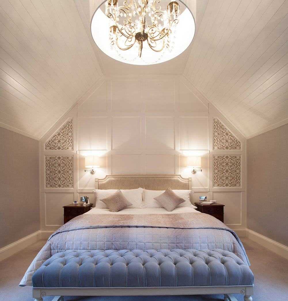 На фото интерьер мансардной спальни с освещением, виде потолочных лампочек и прикроватных светильников.